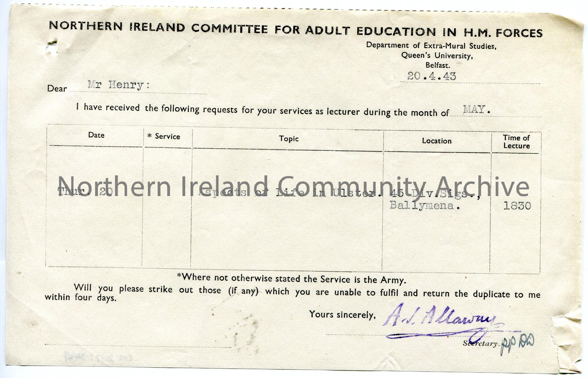 Typed letter on headed paper to Sam Henry re lecture to troops. Request of services as lecturer on 20th May 1943 on 'Aspects of Life in Ulster' in Ballymena to 45 Div. Sigs., at 6.30pm.