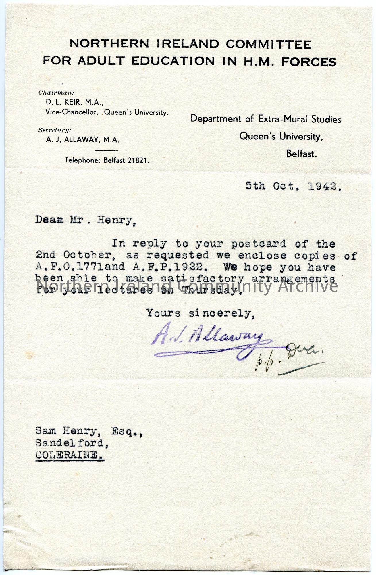 Typed letter on headed paper to Sam Henry re lectures. Encloses forms for expenses claims.