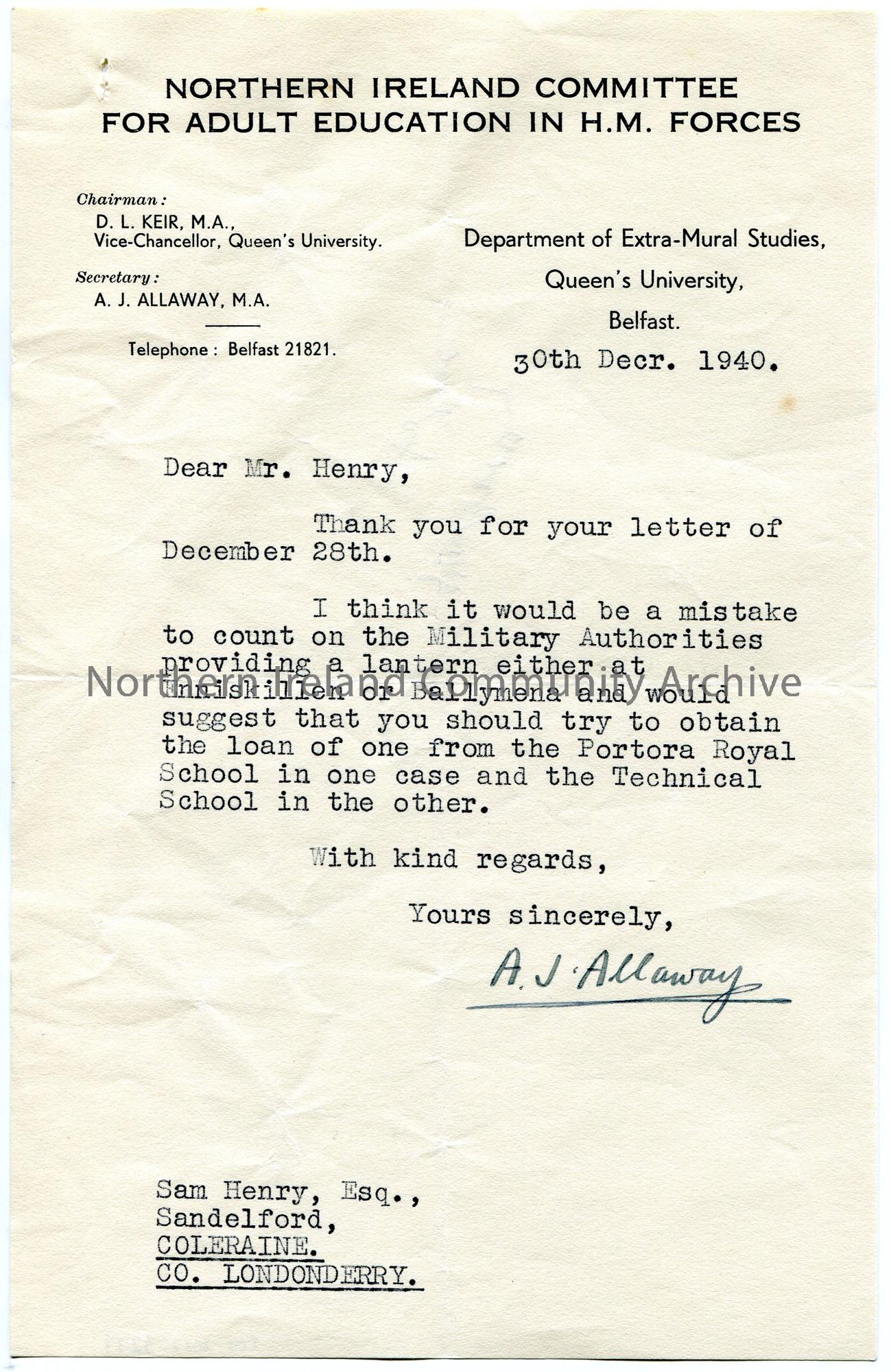 Typed letter on headed paper to Sam Henry re lectures. Recommends Sam obtain a lantern from the Portora Royal School and Technical School in Enniskill…
