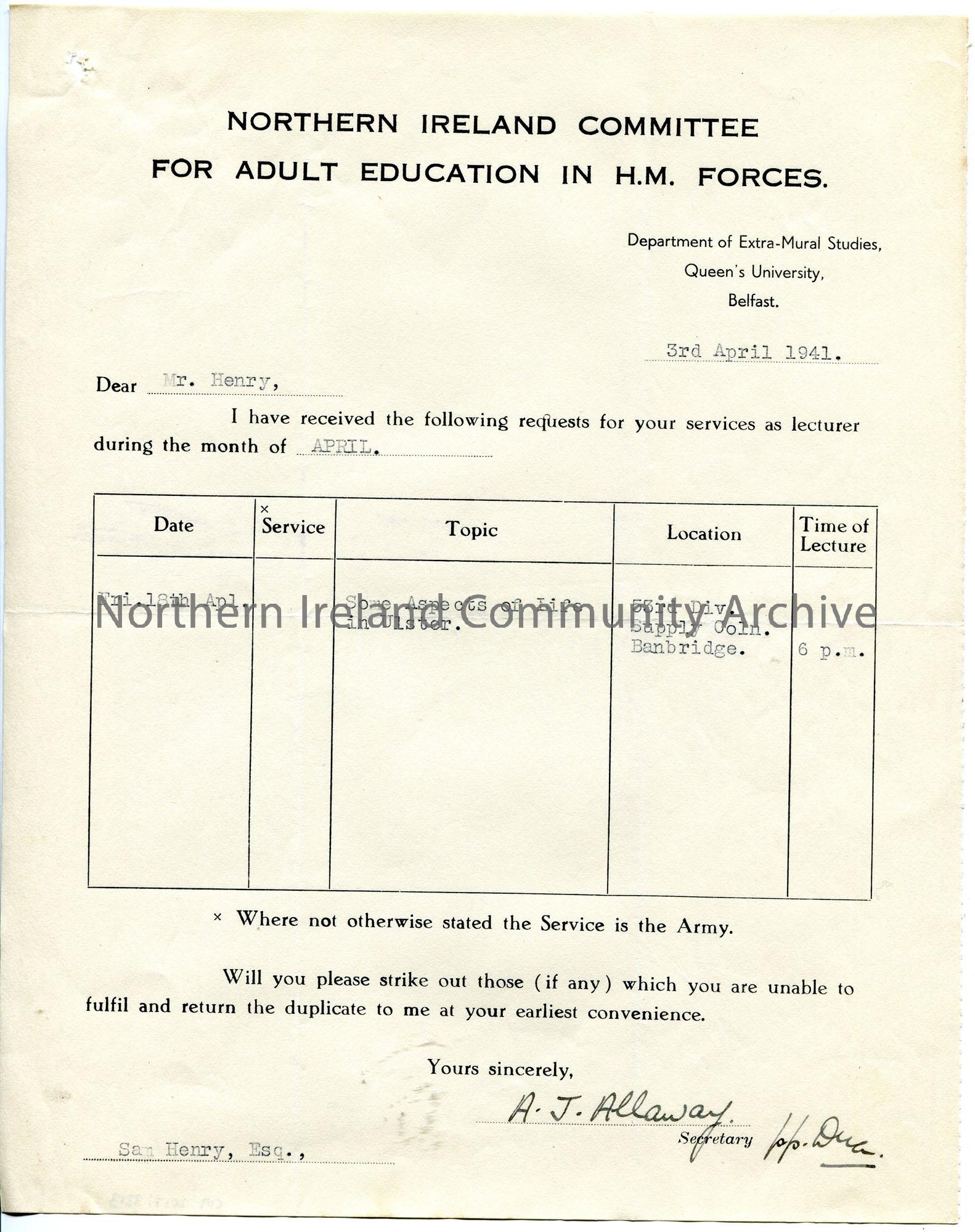 Typed letter on headed paper to Sam Henry re lectures. Requests Sam's services as lecturer at Banbridge on 18th April 1941 to 53rd Division Supply Coln. [Column] on 'Some Aspects of Life in Ulster'.