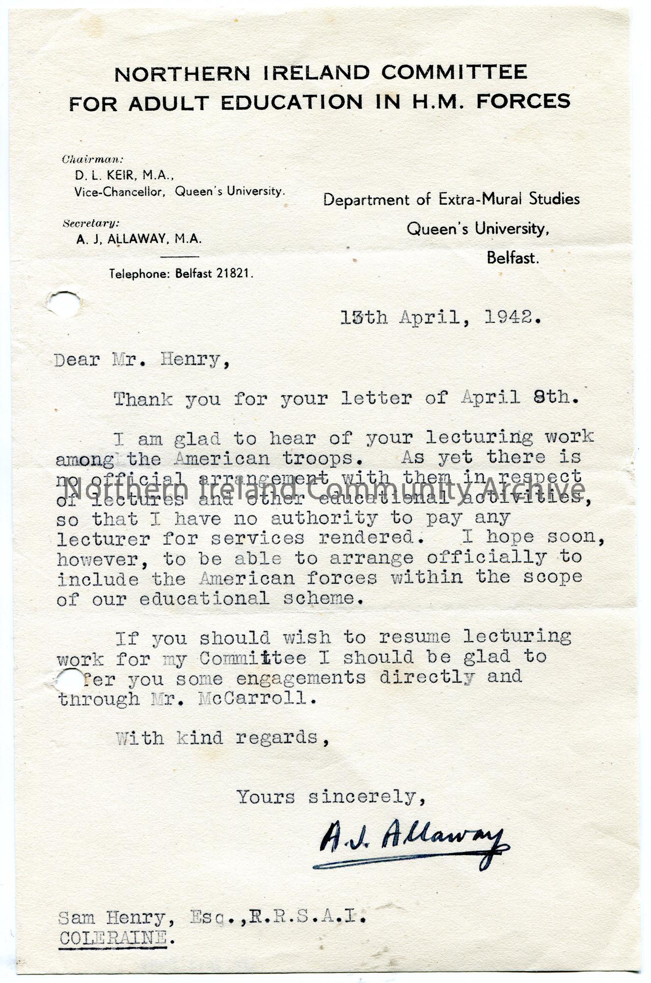 Typed letter on headed paper to Sam Henry re lectures to American troops. Notifying Sam that they have no authority to pay any lecturer for their lectures as there has been no official arrangement made with them. Asks Sam if he wants to continued lecturing through the Committee. [Sam does as he continues lecturing through to and during 1943].