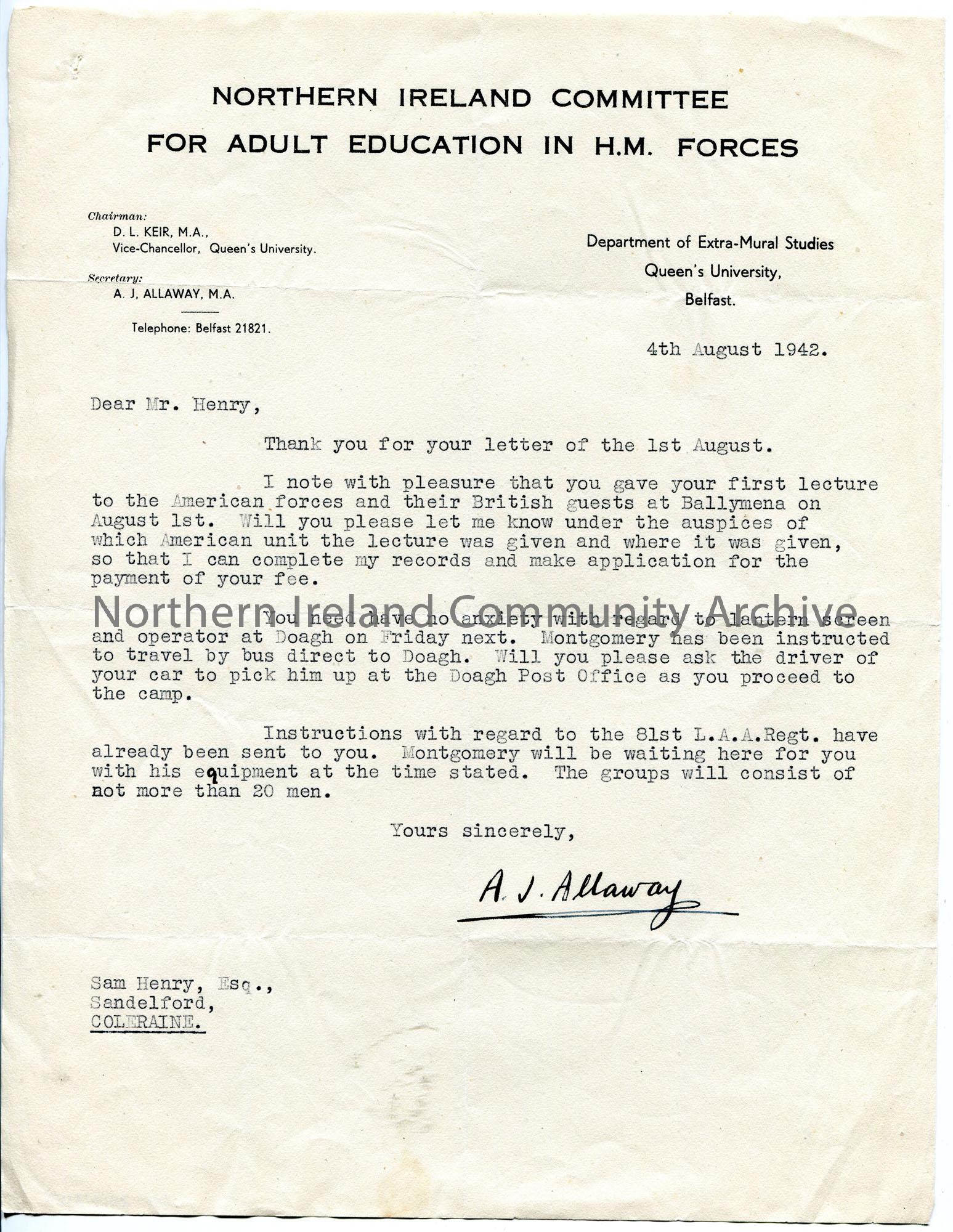 Typed letter on headed paper to Sam Henry re lectures to troops. Asks Sam for the location and name of American Unit to whom he gave a lecture to on 1st August in Ballymena in order to process payment for it. Confirms lantern arrangements for lecture at Doagh.