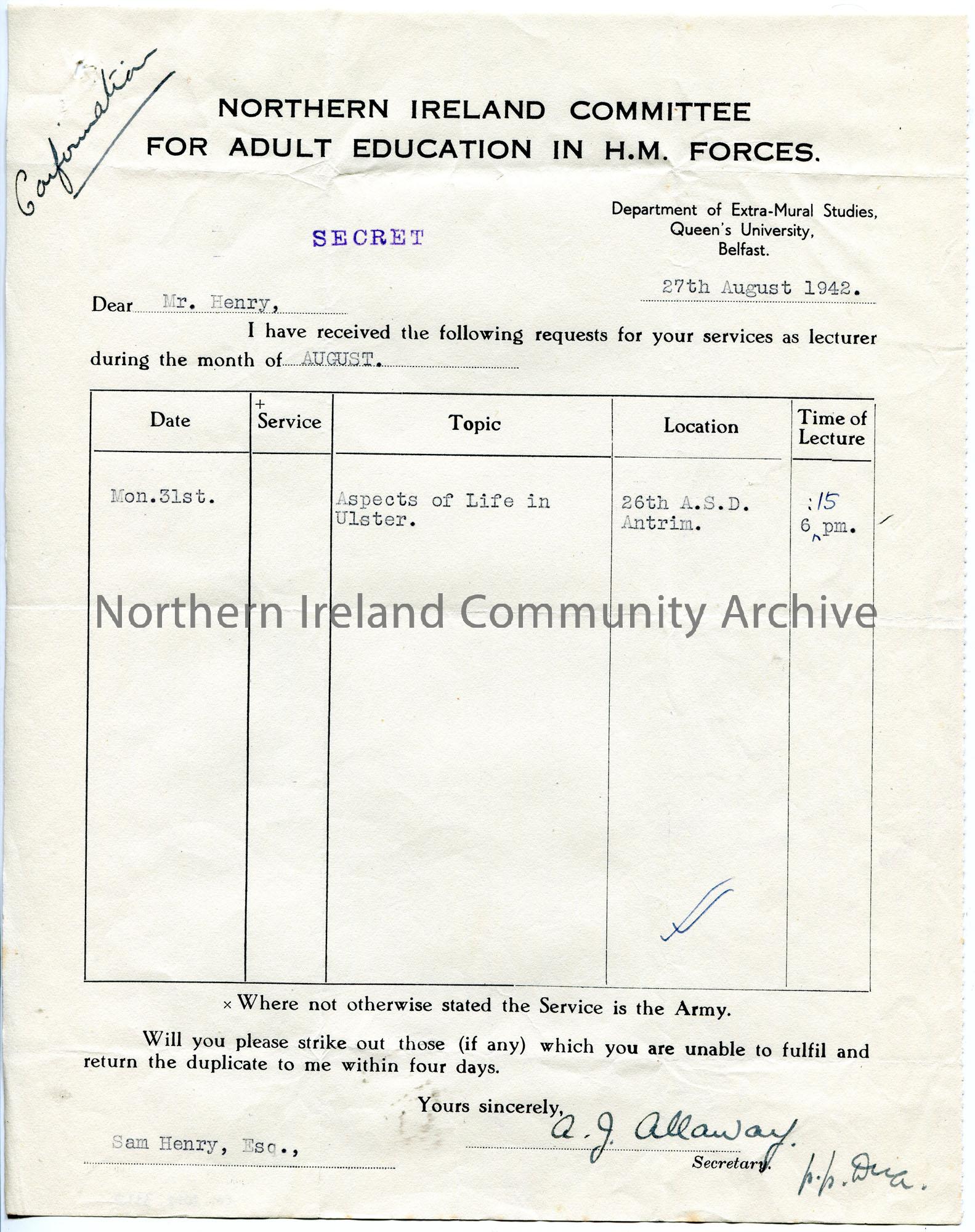 Typed letter on headed paper to Sam Henry re lectures to troops. Confirming lecture on 31st August 1942 on 'Aspects of Life in Ulster' at Antrim to 26th A.S.D. 'SECRET' stamped on letter.
