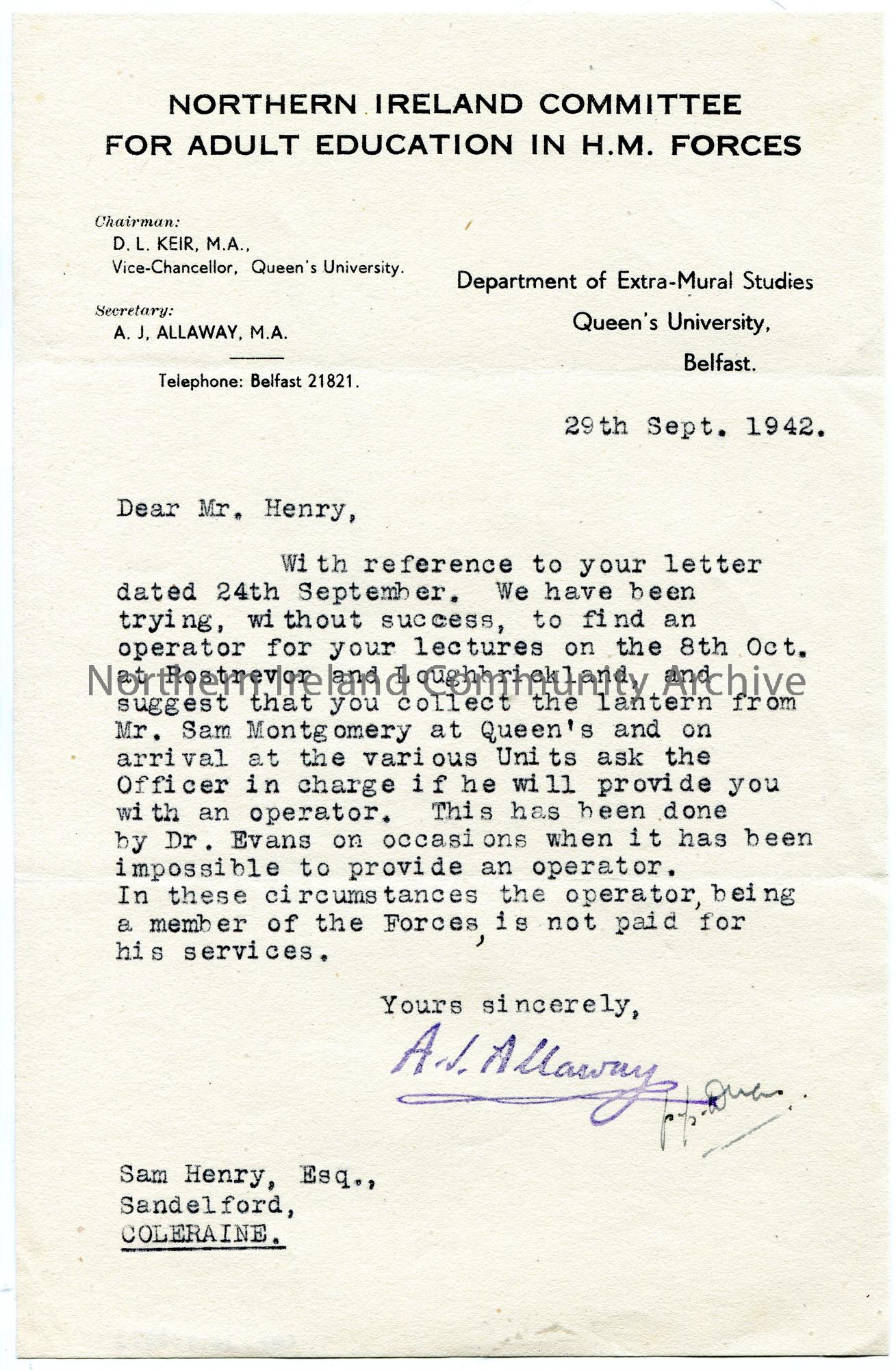 Typed letter on headed paper to Sam Henry re lectures to troops. Instructions for Sam to locate a lantern and operator for lectures at Rostrevor and L…
