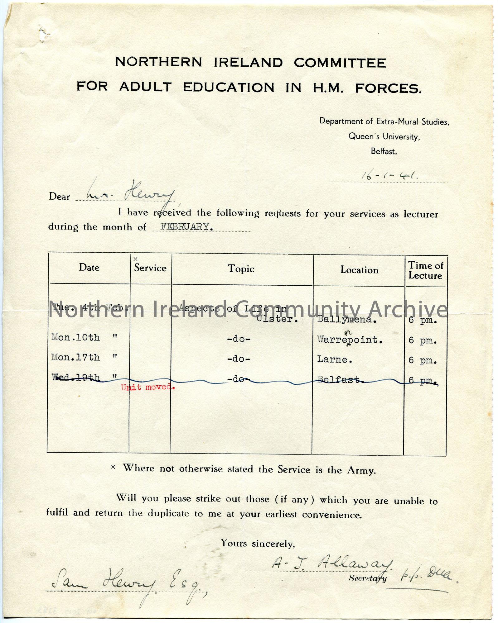 Typed letter on headed paper to Sam Henry re lectures to troops. Request for lectures titled 'Aspects of Life in Ulster' on Tuesday 4th February in Ballymena, Monday 10th February in Warrenpoint, Monday 17th February in Larne. A lecture proposed for Belfast on 19th February is scored out and replaced with 'Unit moved'.