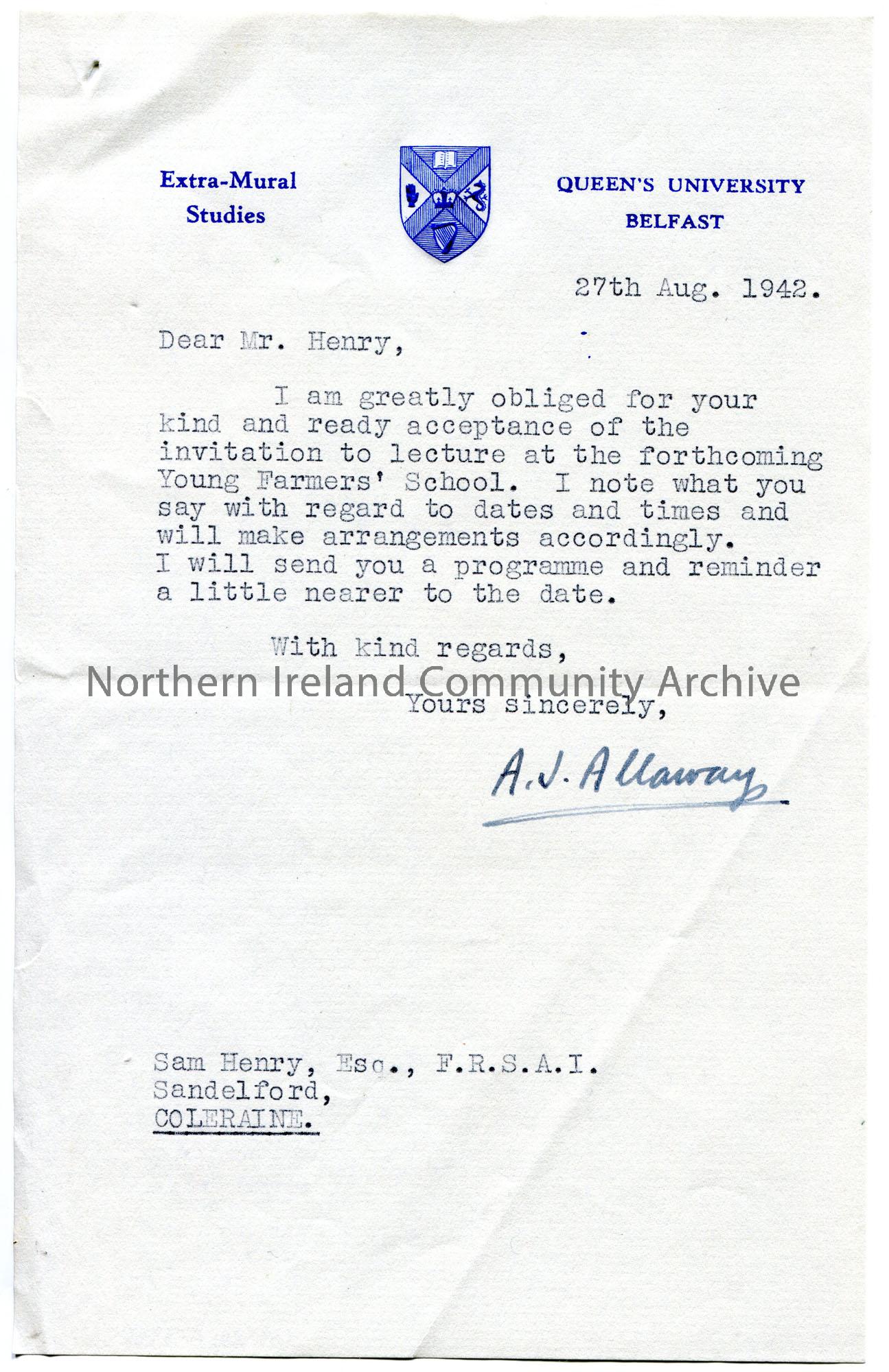 Typed letter on headed paper to Sam Henry re lectures to troops. Sam has agreed to give a lecture to the Young Farmers’ School.