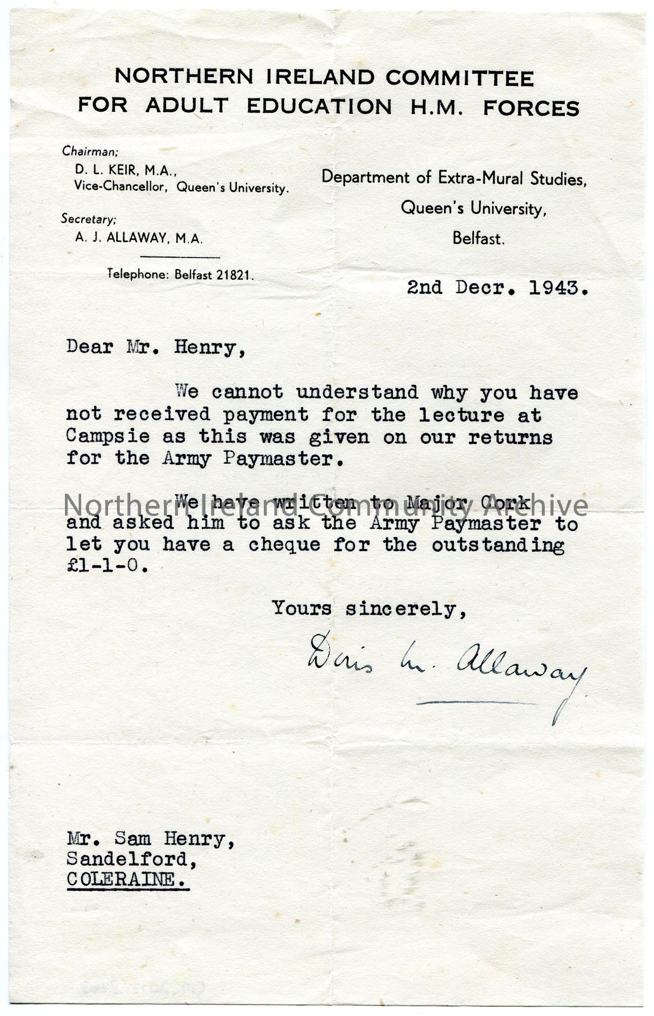 Typed letter on headed paper to Sam Henry re lectures to troops. Sam has not been paid by the Army Paymaster who will send a cheque for lecture fees of £1.1.0.