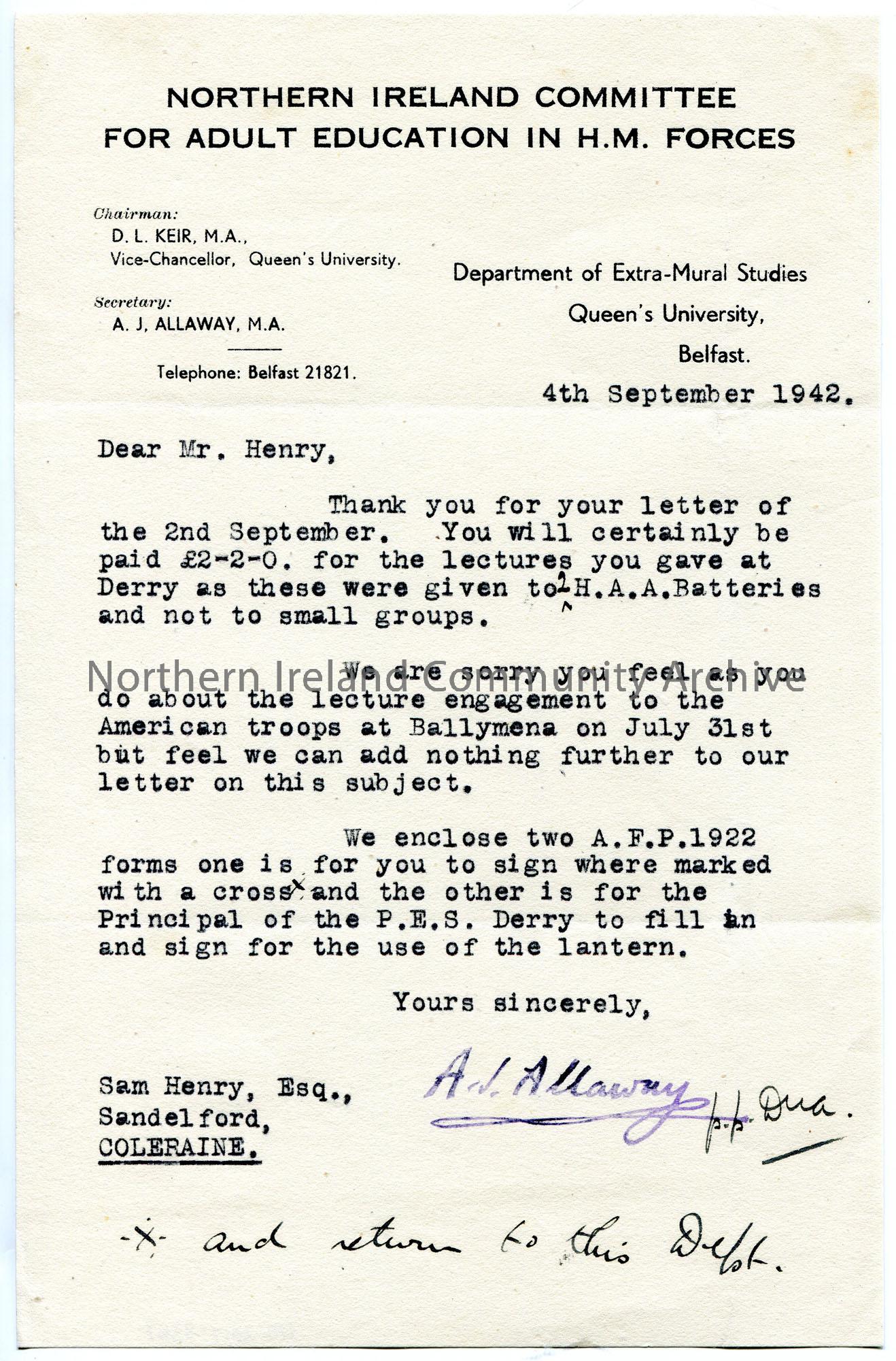 Typed letter on headed paper to Sam Henry re lectures to troops. Sam to be paid £2.0.0 for lectures given to H.A.A. Batteries in Derry. Cannot he…