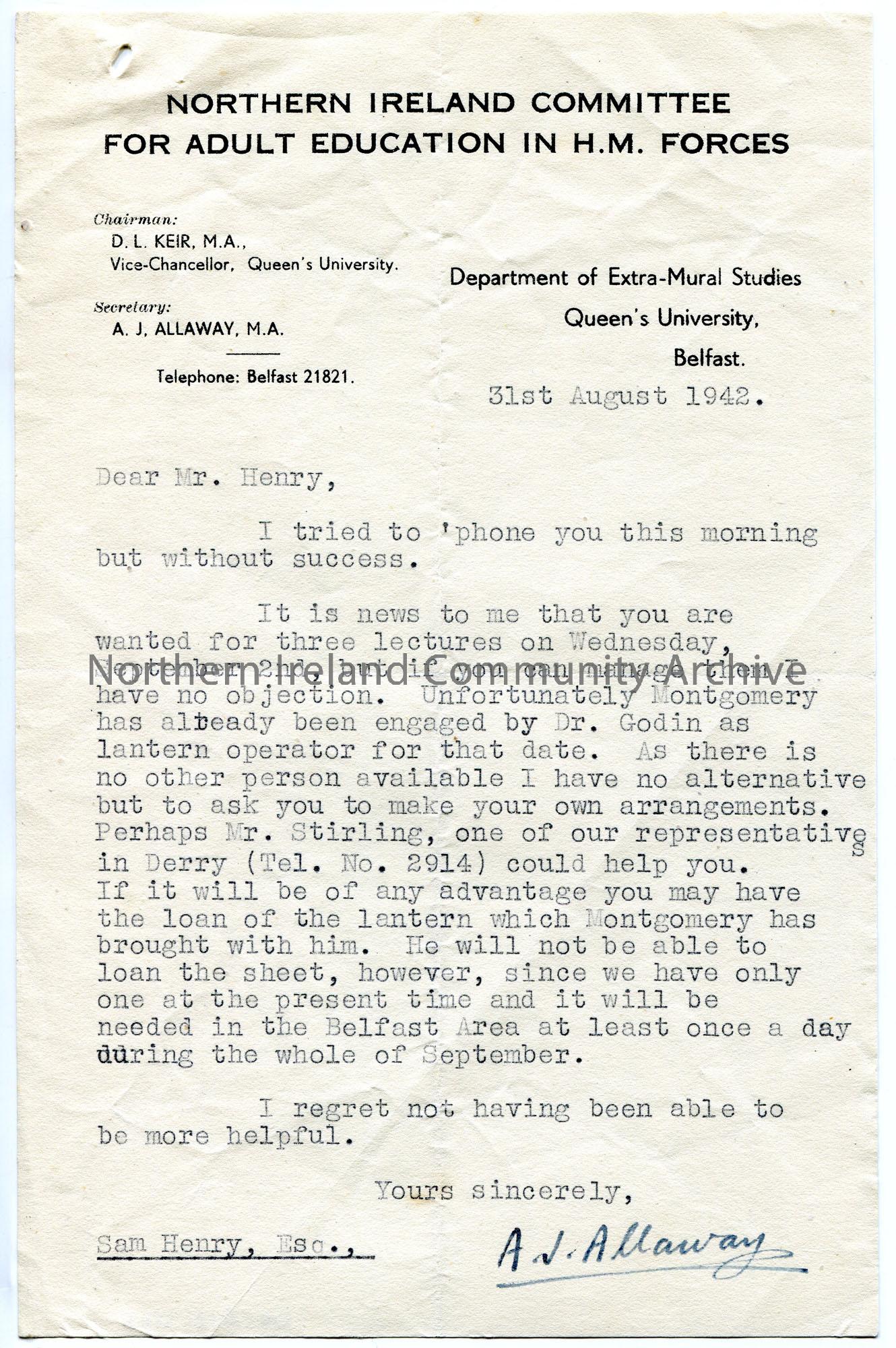 Typed letter on headed paper to Sam Henry re lectures to troops. Sam to carry out 3 lectures on 2nd September. Discusses lantern arrangements.