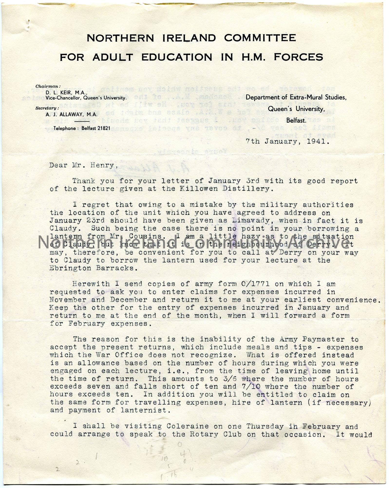 Typed letter on headed paper to Sam Henry re lectures to troops. Thanks Sam for his letter and good report of the lecture at Killowen Distillery [Coleraine]. Informs Sam that a lecture scheduled for Limavady was in fact Claudy on 23rd January. Encloses copies of expenses form 0/1771 for Sam. Talks through Sam's allowances and expenses for the lectures.