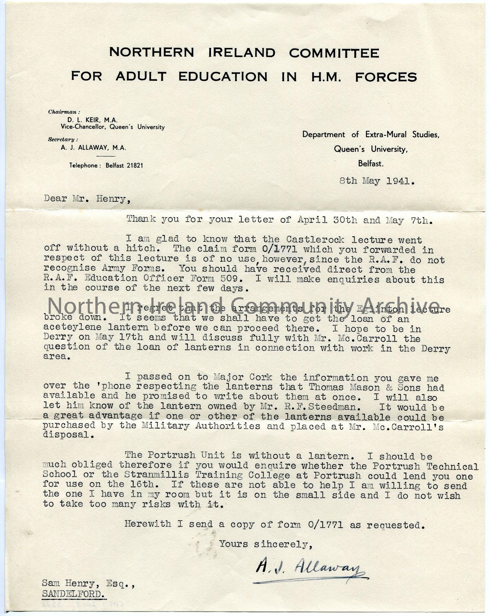 Typed letter on headed paper to Sam Henry re lectures to troops. The lecture at Castlerock was a success. Informs Sam of the correct claim for to use for expenses. Arrangements for the lecture as Eglinton has broken down. Discusses lantern arrangements.