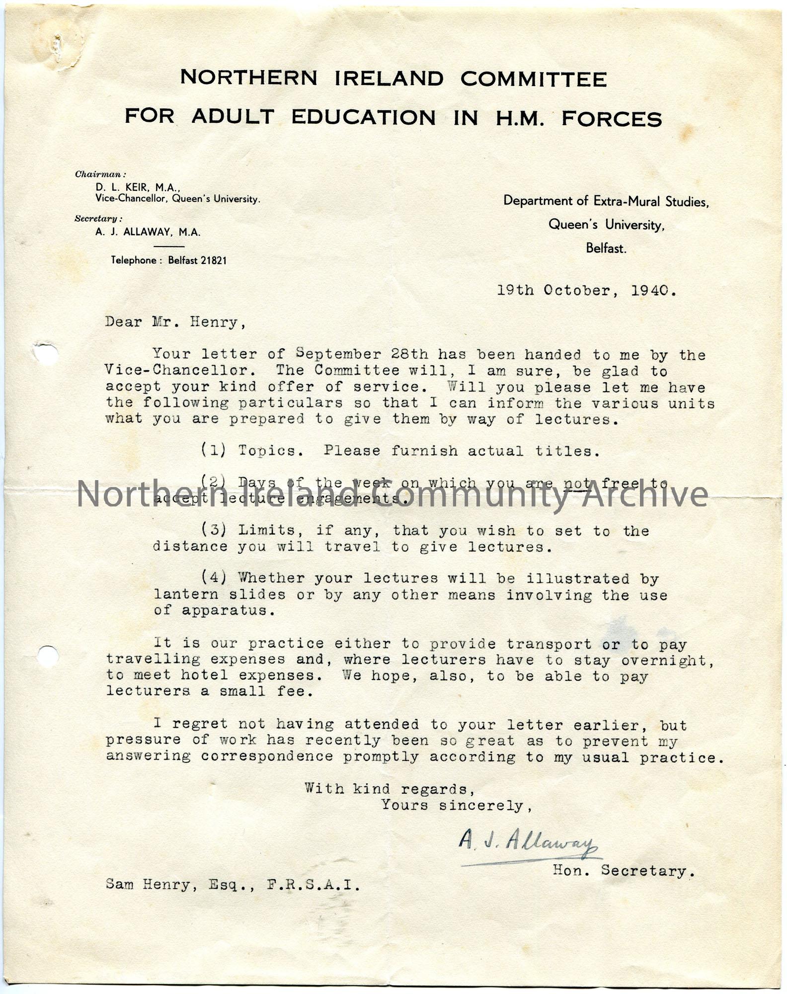 Typed letter on headed paper to Sam Henry. Recognition of Sam’s services by way of lectures. Asks for information re the topics, available days, trave…