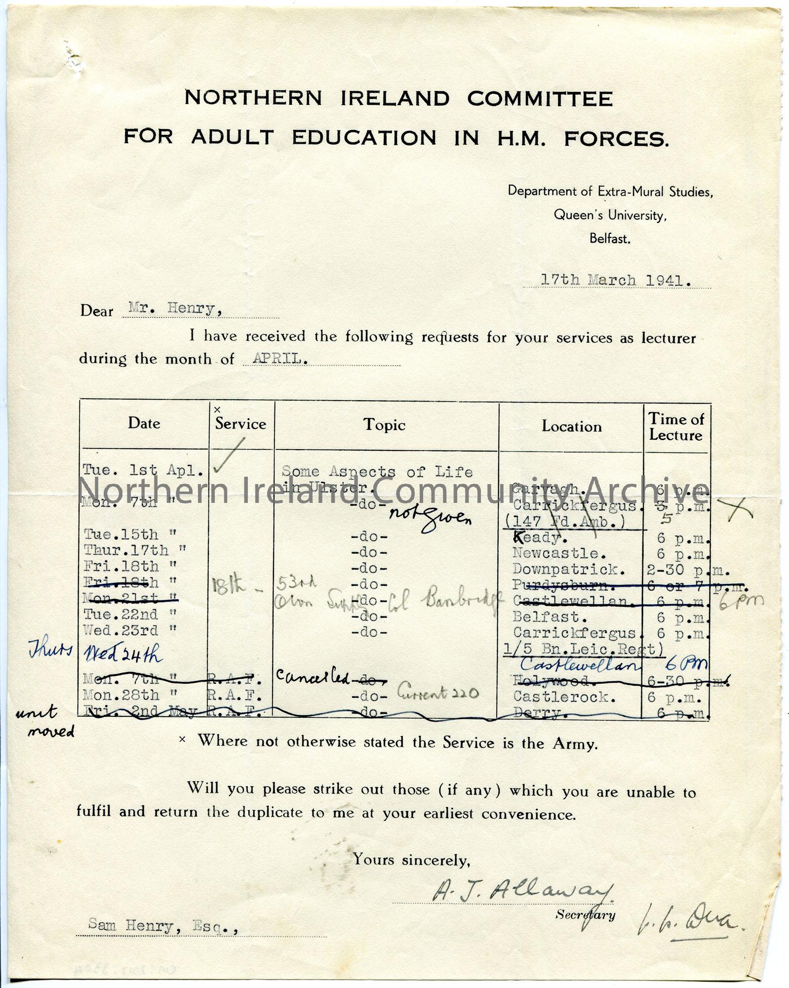 Typed letter on headed paper to Sam Henry. Request for services as lecturer to troops during the month of April. Lists various dates and locations. List is annotated with handwriting, some are scored out, etc. Locations mentioned are Garvagh, Keady, Newcastle, Downpatrick, Belfast, Carrickfergus, Castlewellan, Castlerock.