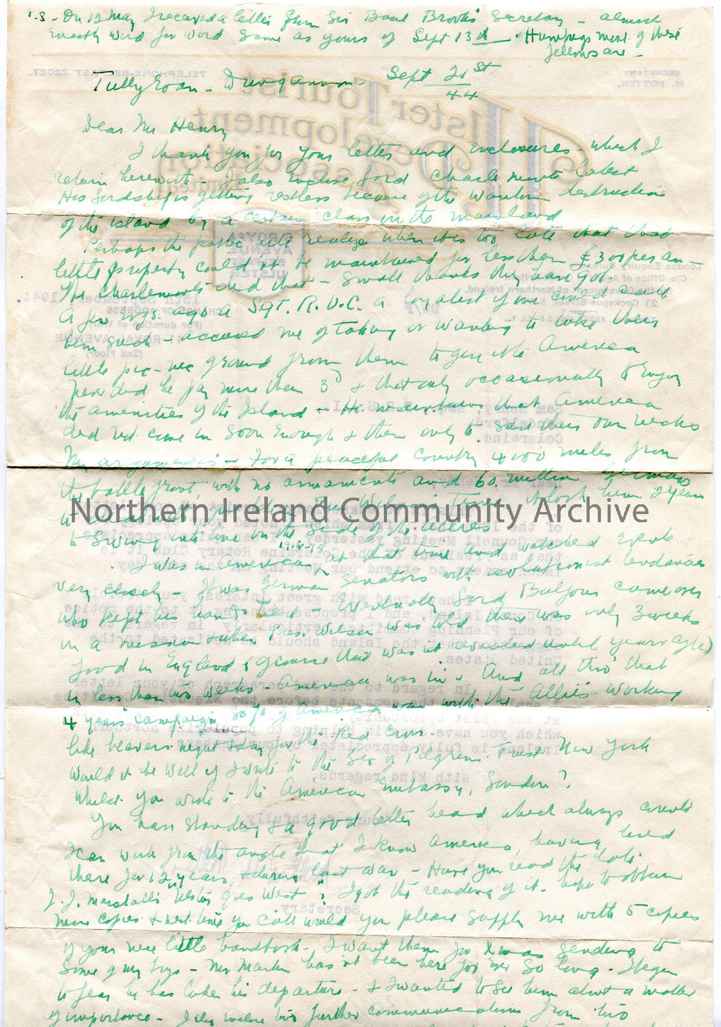 Typed letter on headed paper to Sam Henry. Sam cannot attend their meeting as he is President of Coleraine Rotary Club and has to attend his own meeting. To bring Sam's proposal of dedicating Coney Island to the U.S.A. to the Planning Committee meeting. Sam had sent this letter to Miss Florence Tate whose reply is handwritten on the reverse. She gives her reasons for agreeing with the proposal for Coney Island.