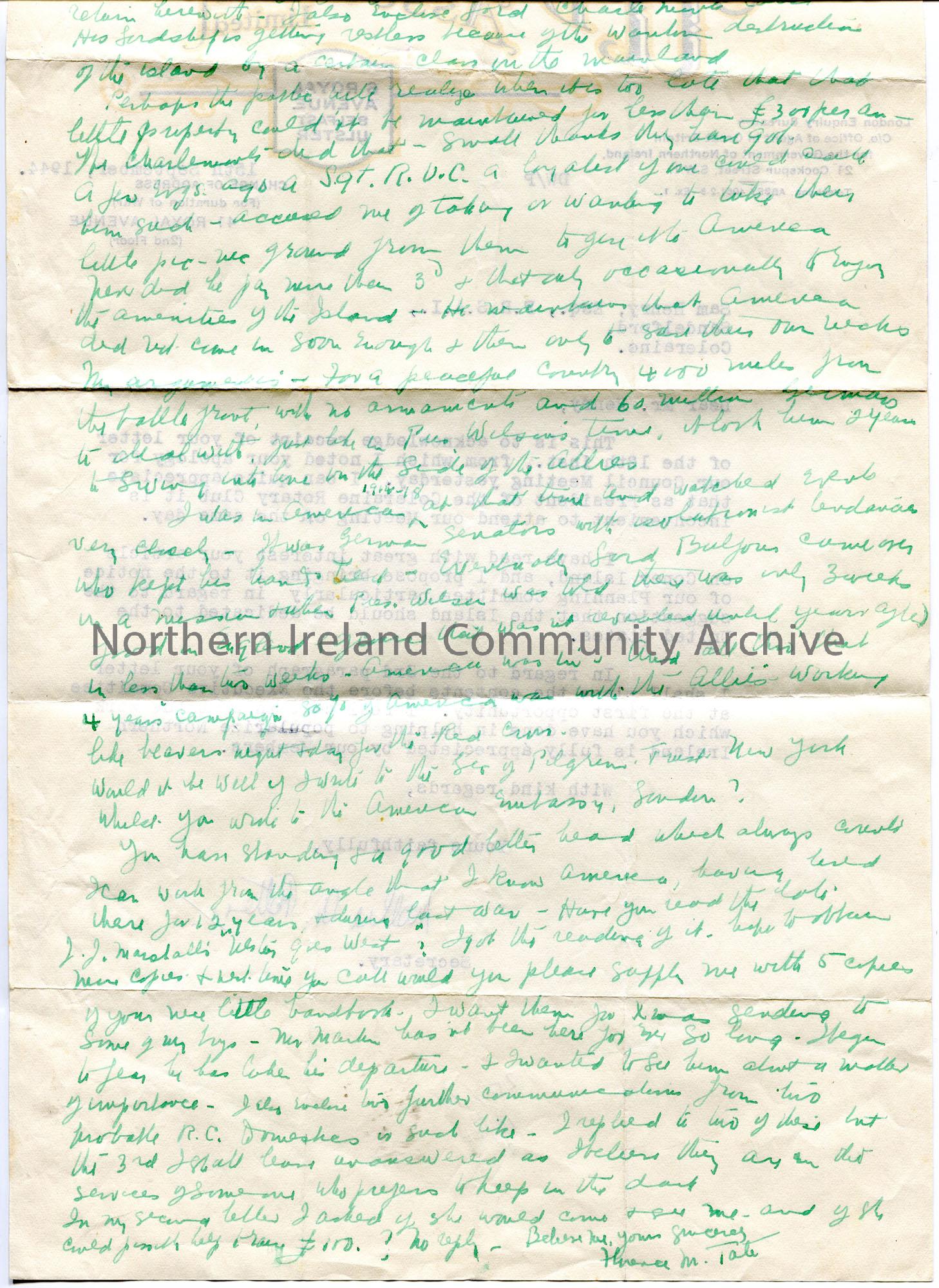 Typed letter on headed paper to Sam Henry. Sam cannot attend their meeting as he is President of Coleraine Rotary Club and has to attend his own meeting. To bring Sam's proposal of dedicating Coney Island to the U.S.A. to the Planning Committee meeting. Sam had sent this letter to Miss Florence Tate whose reply is handwritten on the reverse. She gives her reasons for agreeing with the proposal for Coney Island.