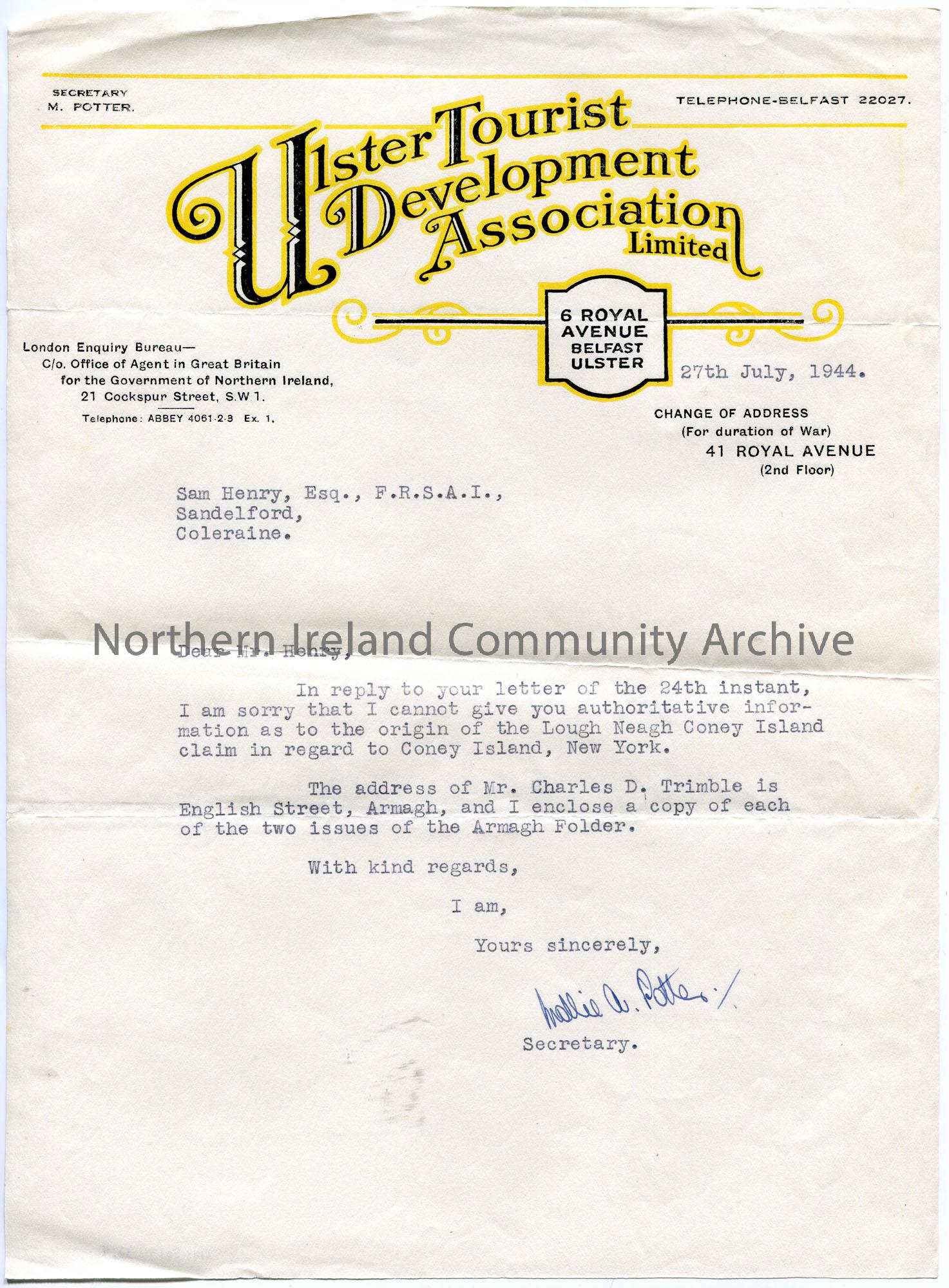 Typed letter on headed paper to Sam Henry. Sam had enquired re the origin of the name of Coney Island, Lough Neagh and connections to New York. They have no authority to give Sam such information. Provides Sam with the address of Mr Charles Trimble as English Street, Armagh. Encloses two issues of the Armagh Folder.