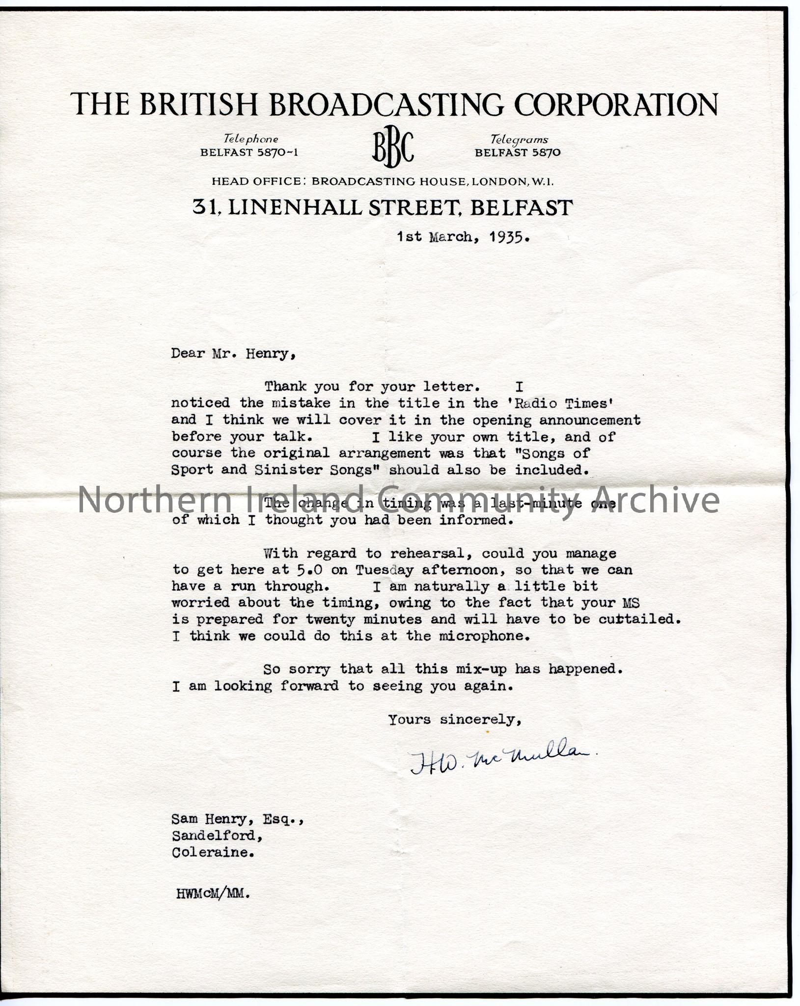 Typed letter on headed paper to Sam Henry, Sandelford, Coleraine. Black border around page. To mention a mistake in the title of a broadcast at beginning of talk. 'Songs of Sport and Sinister Songs' to be included in original arrangement. Makes arrangements for rehearsal.