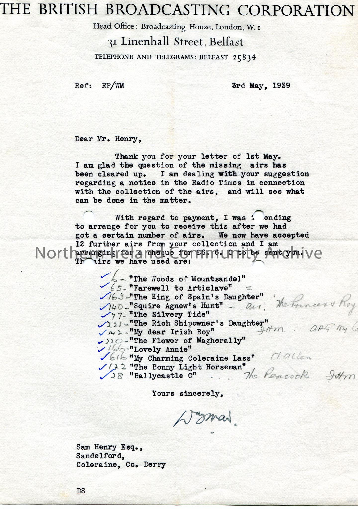 Typed letter on headed paper to Sam Henry, Sandelford, Coleraine, Co. Derry. Sam has suggested a notice in the Radio Times. Cheque of £6.6.0 to be sent to Sam for airs. Annotated list of songs used.