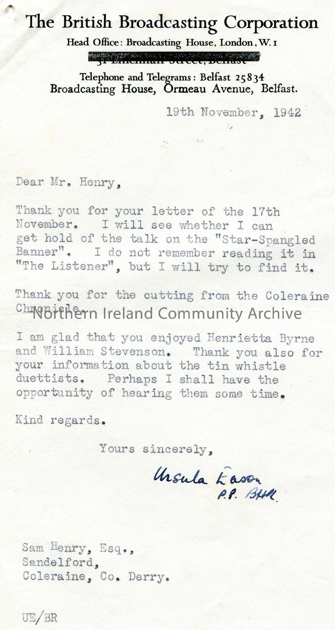 Typed letter on headed paper to Sam Henry, Sandelford, Coleraine, Co. Derry. To locate the talk on the 'Star Spangled Banner' and cannot remember reading it in 'The Listener'. Thanks Sam for the cutting from the Coleraine Chronicle. Glad Sam enjoyed Henrietta Byrne and William Stevenson. Thanks Sam for information on tin whistle duettists.