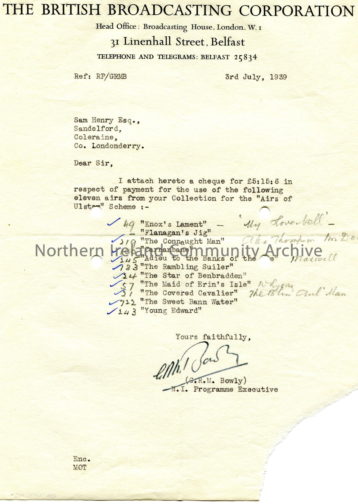 Typed letter on headed paper to Sam Henry, Sandelford, Coleraine, Co. Londonderry. Encloses cheque for £5.15.6 for use of 11 airs for the 'Airs of Ulster' Scheme. Annotated list of the songs is noted.