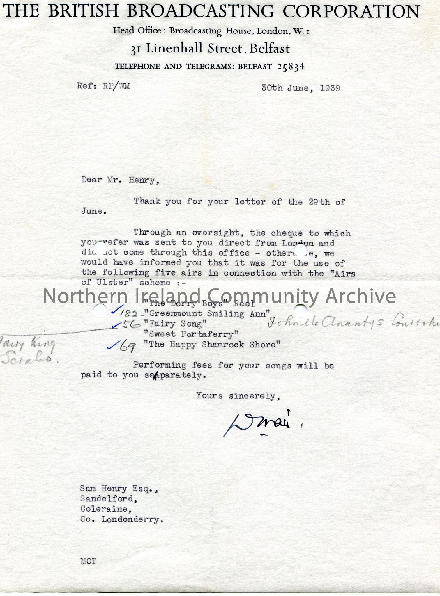 Typed letter on headed paper to Sam Henry, Sandelford, Coleraine, Co. Londonderry. Explains to Sam that the cheque sent to him was for airs 'The Derry Boys' Reel, 'Greenmount Smiling Ann', 'Fairy Song', 'Sweet Portaferry' and 'The Happy Shamrock Shore'. Sam to receive performing fees separately.