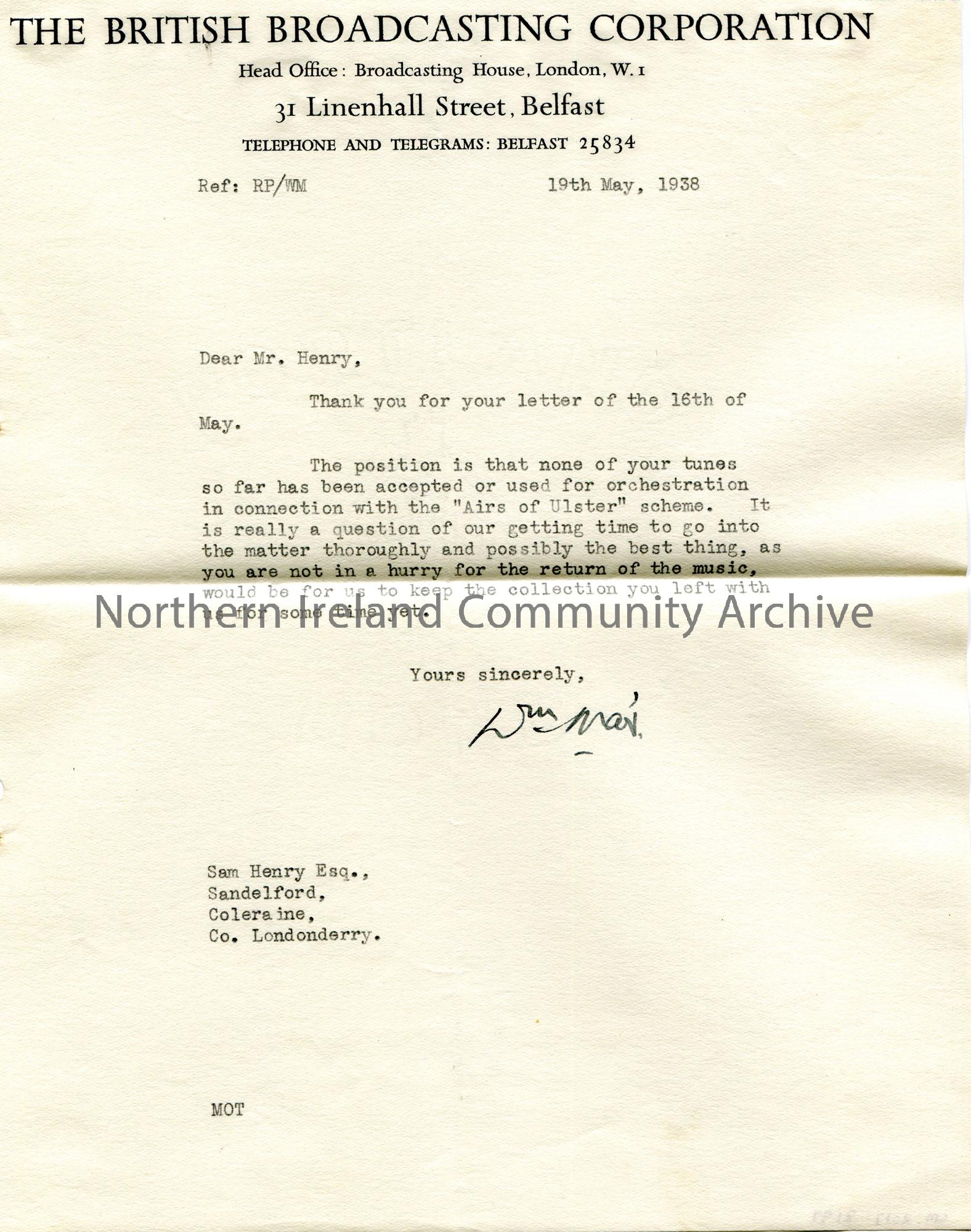 Typed letter on headed paper to Sam Henry, Sandelford, Coleraine, Co. Londonderry. Thanks Sam for his letter of 16th May. Informs Sam that none of the songs have been chosen as yet for inclusion in the 'Airs of Ulster' Scheme and to let the organisation keep them a while longer.