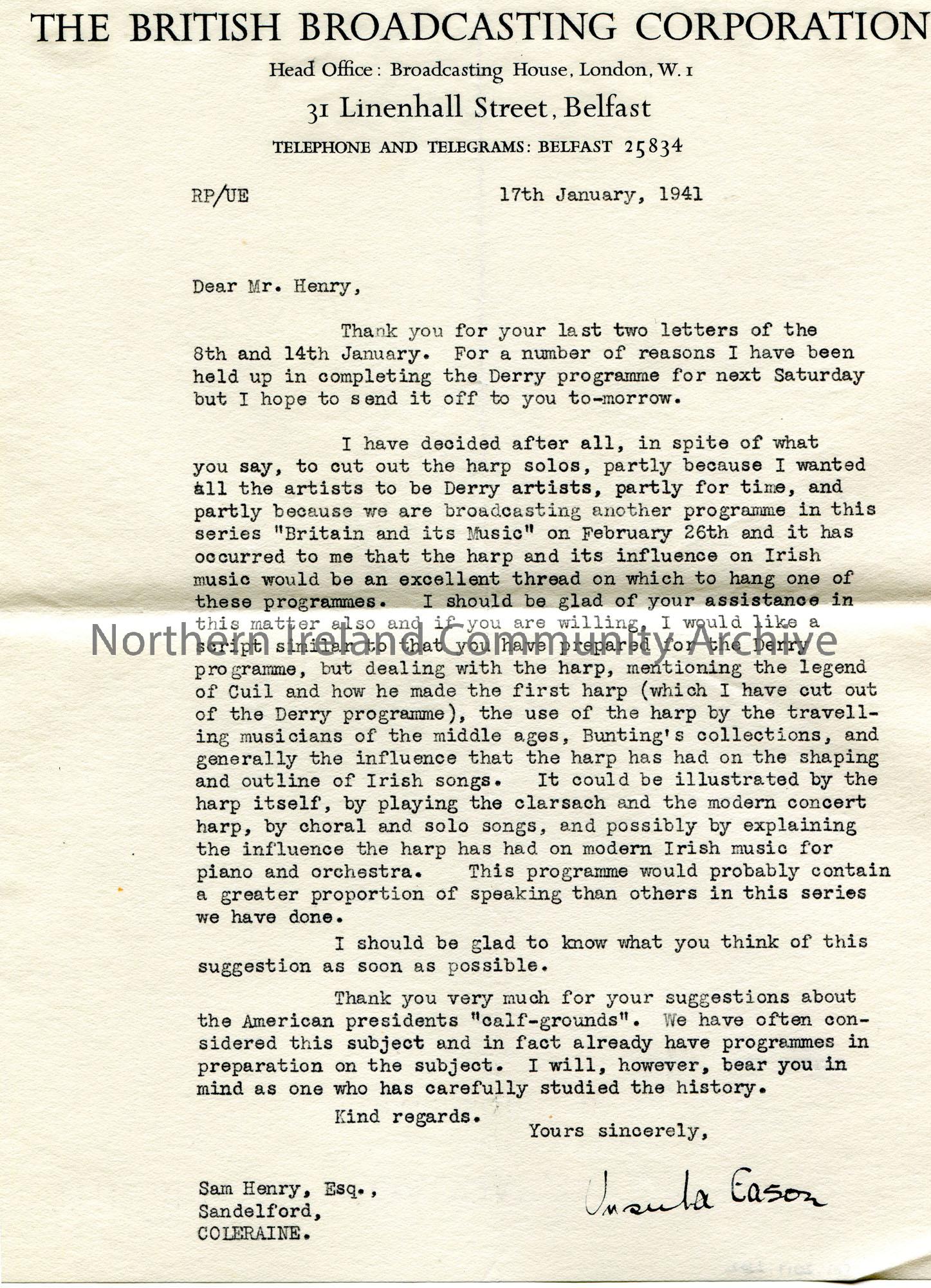 Typed letter on headed paper to Sam Henry, Sandelford, Coleraine, Co. Londonderry. Writing re the Derry programme for next Saturday. Asks Sam to prepare a script re the harp in Irish music and thanks him for his suggestion of a programme re American presidents.