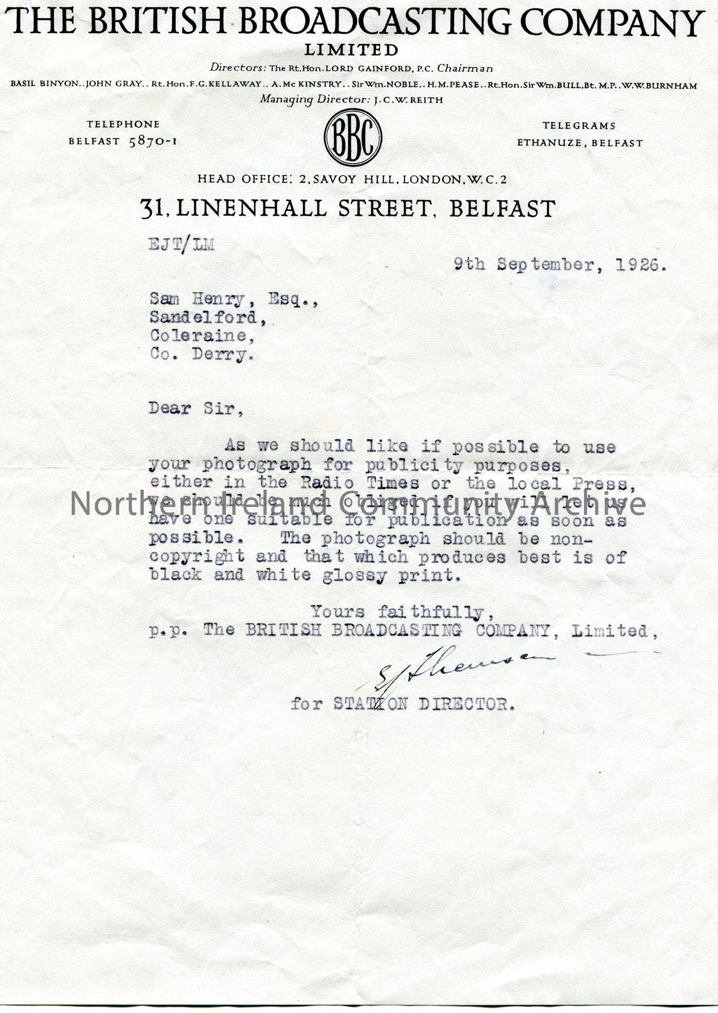 Typed letter on headed paper to Sam Henry, Sandelford, Coleraine, Co.Derry. Sam to send in a photograph of himself, preferably black and white glossy print, for publication in the Radio Times or local Press.