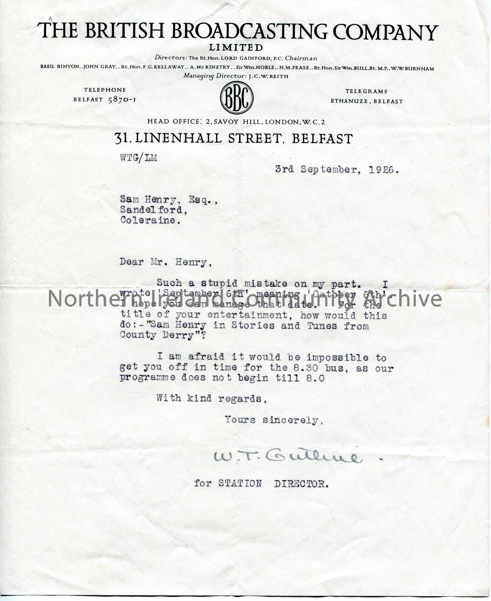 Typed letter on headed paper to Sam Henry, Sandelford, Coleraine. Corrects error of broadcast date in previous letter from 6th September to 6th Octobe…