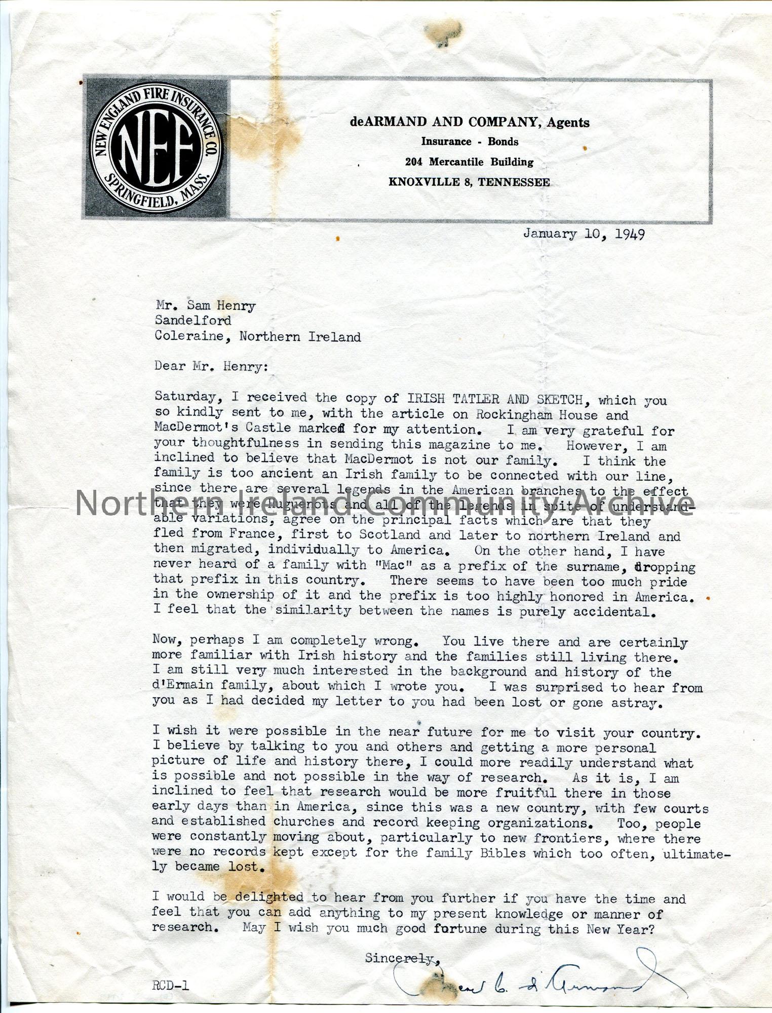 Typed letter on headed paper to Sam Henry, Sandelford, Coleraine, Northern Ireland. Thanks Sam for the copy of 'Irish Tatler and Sketch' featuring an article on MacDermot's Castle. [Sam has been researching the family name d'Armand - CM:2017:2996]. Tells Sam he does not believe he is descended from the MacDermots and hopes Sam can do further research for him.