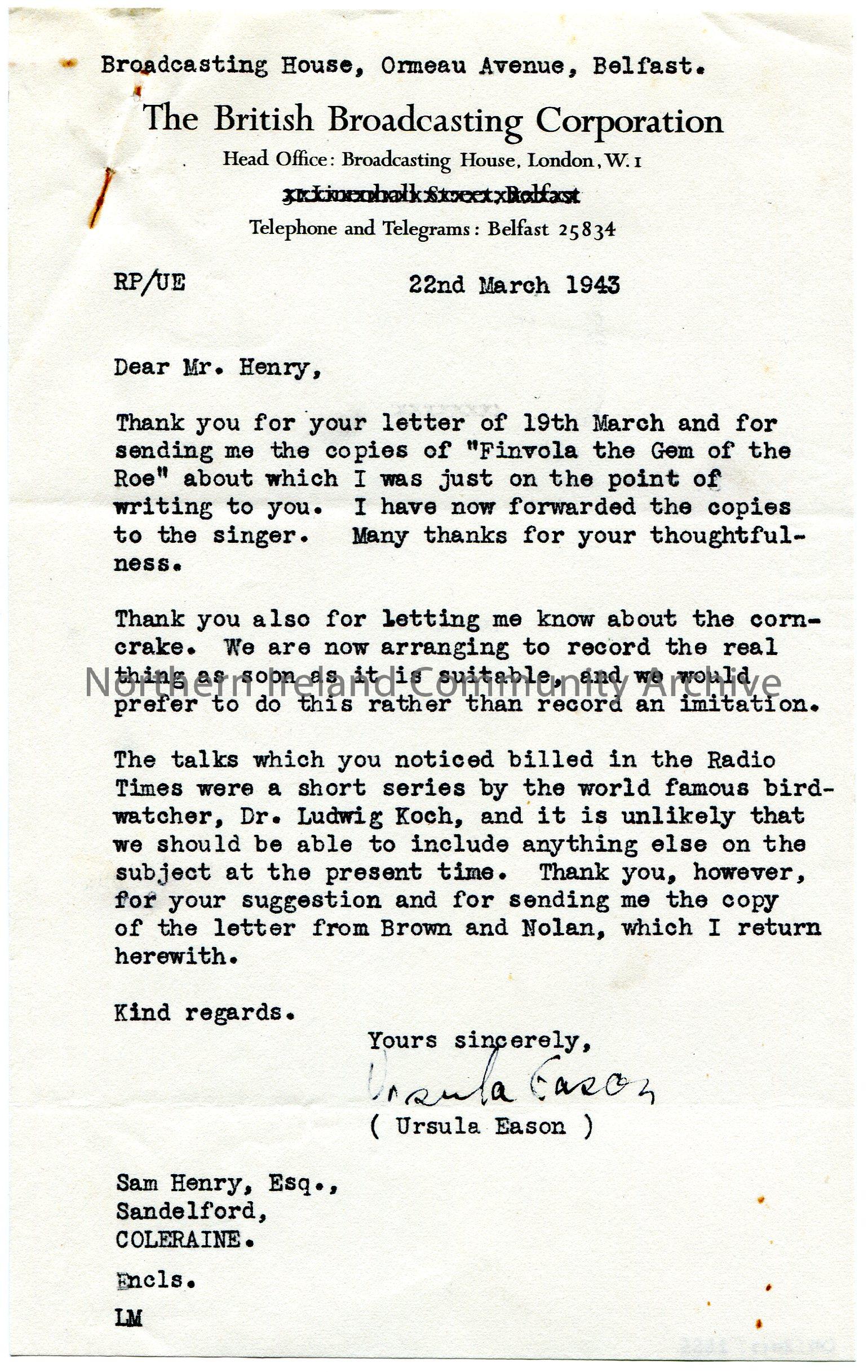 Typed letter on headed paper to Sam Henry, Sandelford, Coleraine. Thanks Sam for sending her copies of 'Finvola the Gem of the Roe'. Also thanks Sam for letting her know about the corncrake and hopes to record the 'real thing'. Returns copy to Sam, a letter from Brown [Browne] and Nolan.