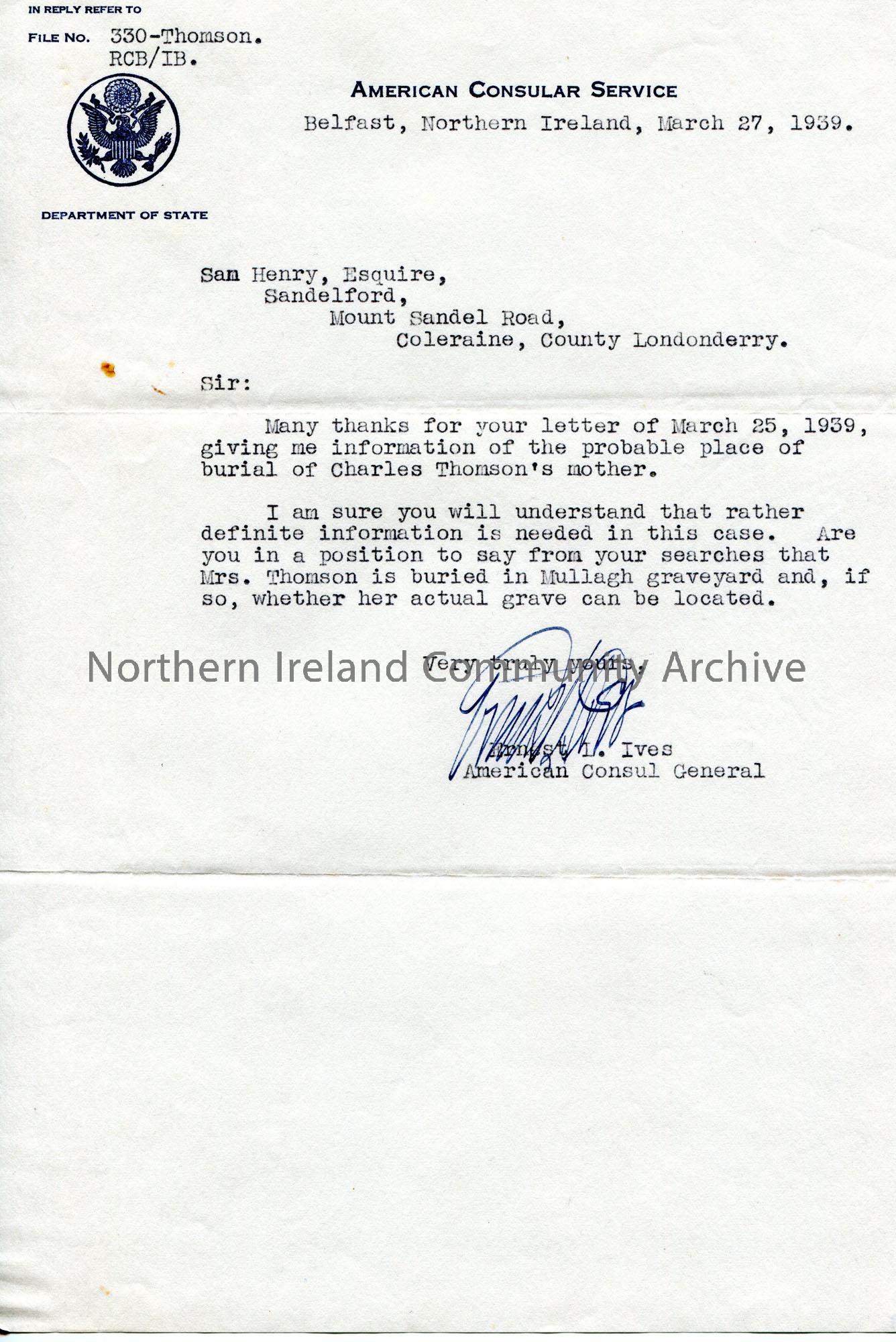 Typed letter on headed paper to Sam Henry, Sandelford, Mountsandel, Coleraine. Asks Sam to confirm the burial place of Charles Thomson’s mother as Mul…