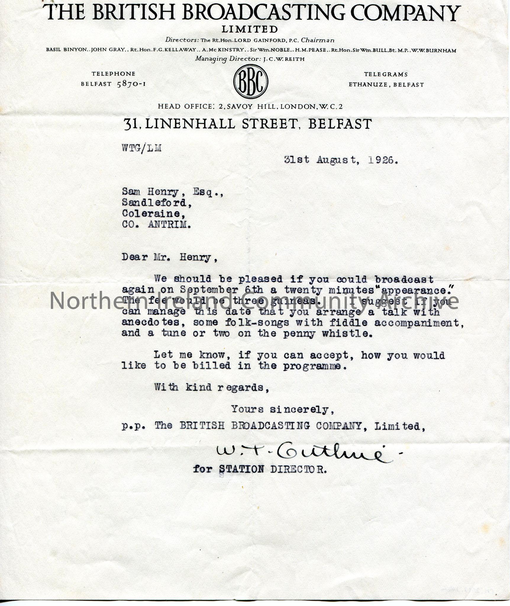 Typed letter on headed paper to Sam Henry, Sandleford [Sandelford], Coleraine, Co. Antrim. Requesting Sam to prepare a talk for broadcast on 6th September re anecdotes, folksongs and to include the fiddle and penny whistle.