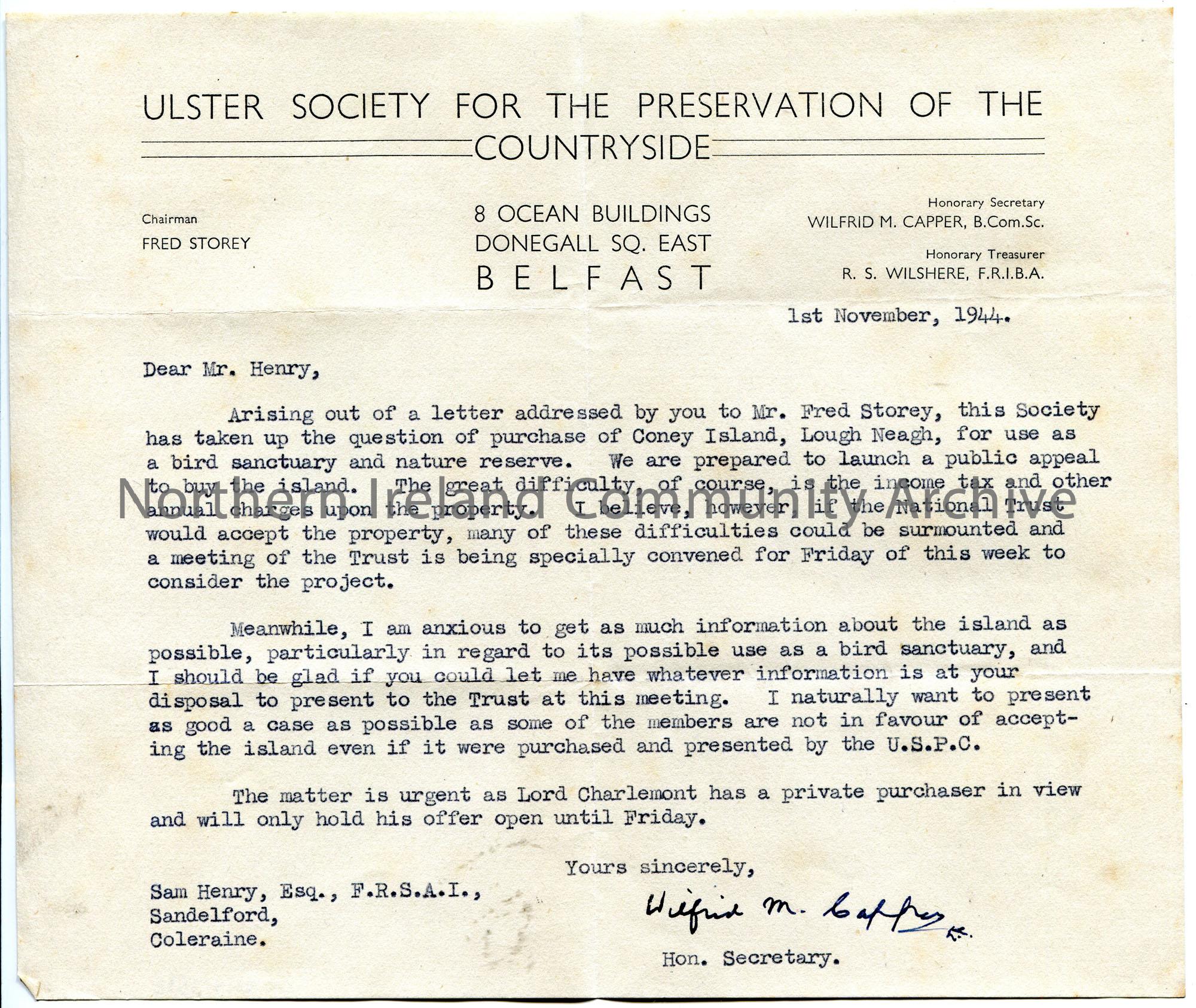 Typed letter on headed paper to Sam Henry. Writes that there is a meeting with the National Trust to discuss the purchase of Coney Island. Asks Sam for information he has of the island. States it is urgent due to other interest from a private buyer.