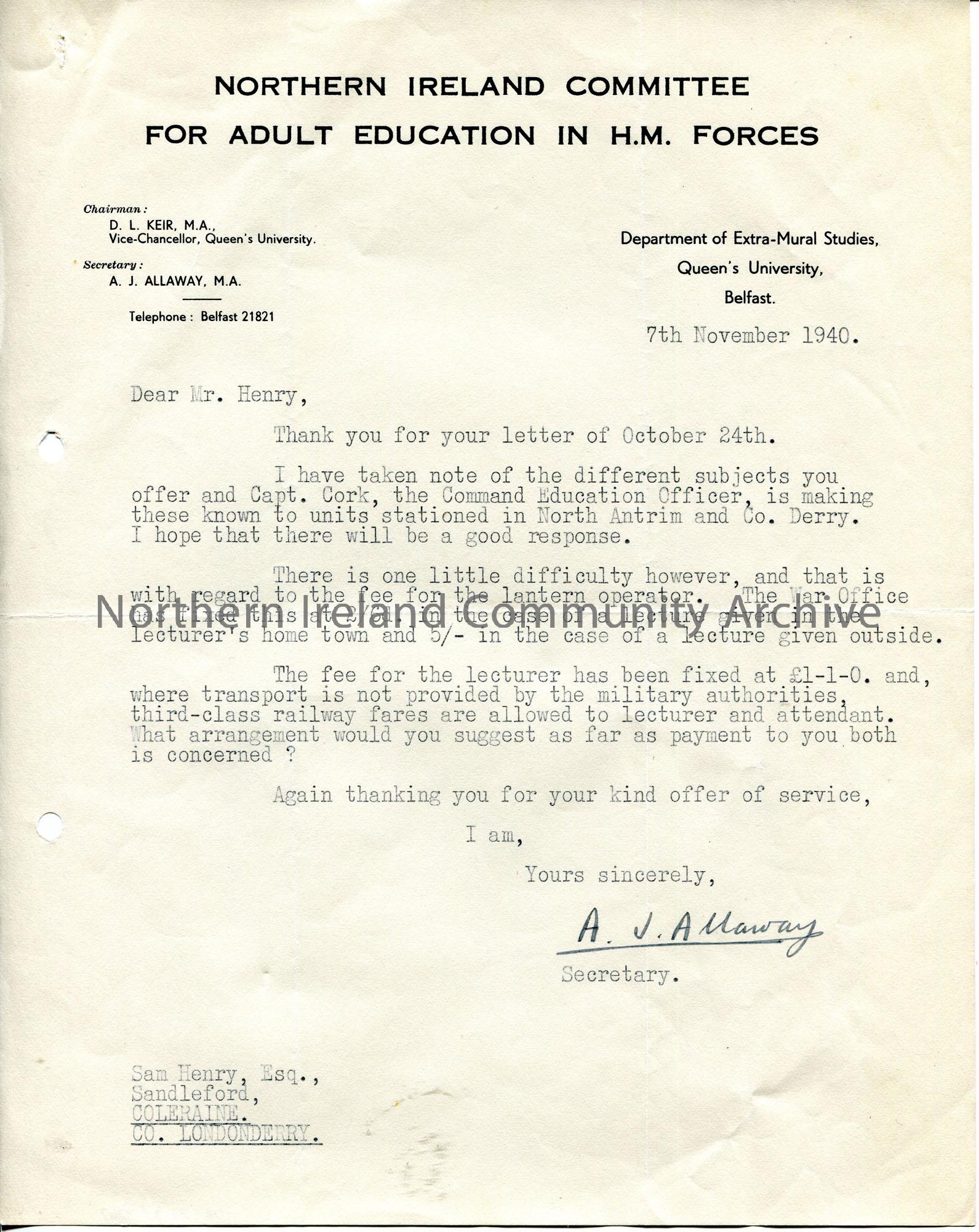 Typed letter on headed paper to Sam Henry. Writing re lectures to troops. Captain Cork, Command Education Officer, to let units stationed in North Antrim and Co. Derry of the topics provided by Sam for lectures. Discusses the fees for the lantern operator. States that lecturer fees are £1.1.0 and travel will be 3rd class.