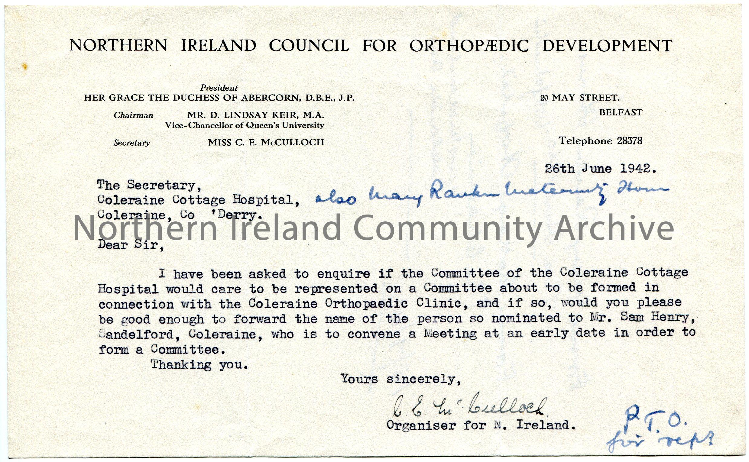 Typed letter on headed paper to The Secretary, Coleraine Cottage Hospital, Coleraine, Co. Derry. Asking if Coleraine Cottage Hospital Committee wish to be represented in connection with Coleraine Orthopaedic Clinic. Name of nominee to be forwarded to Sam Henry. Handwritten note of two nominees on back of letter - The Hon Sec from Mary Rankin House and the Chairman from the Cottage Hospital. Note dated 15th July 1942.