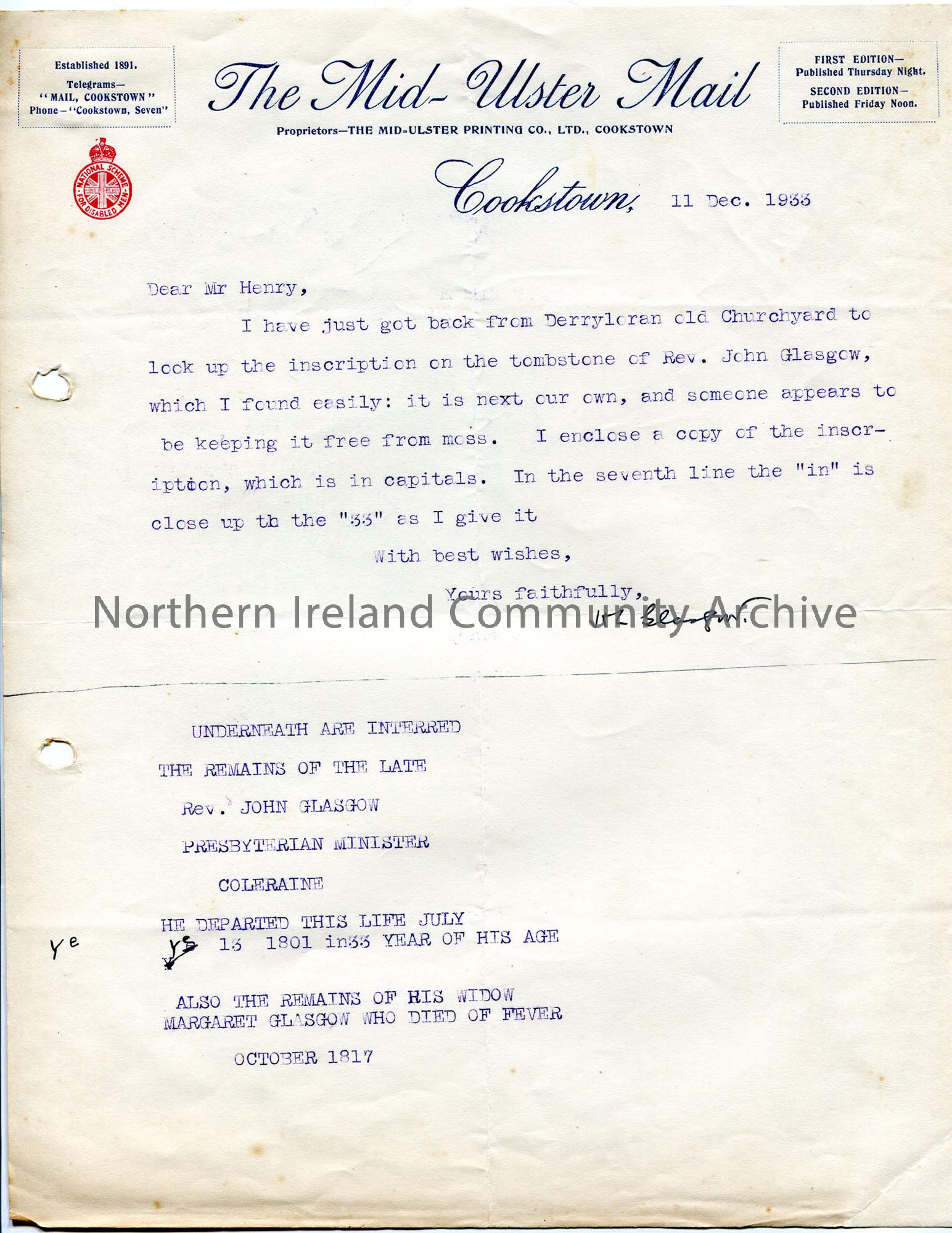 Typed letter on Mid-Ulster Mail headed notepaper, containing headstone inscription of Rev John Glasgow, died 1801, in Derryloran Old Churchyard