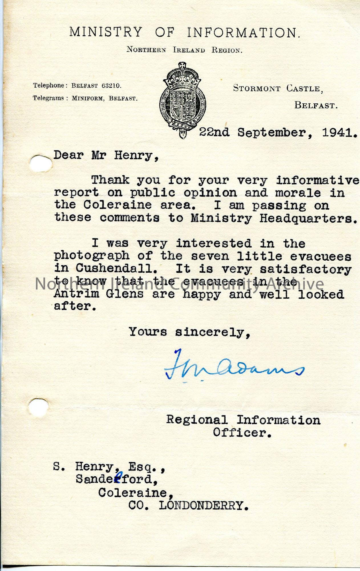 Typed letter on Ministry of Information headed notepaper. Thanking Sam for reports on public opinion and morale and photograph of 7 evacuees in Cushendall