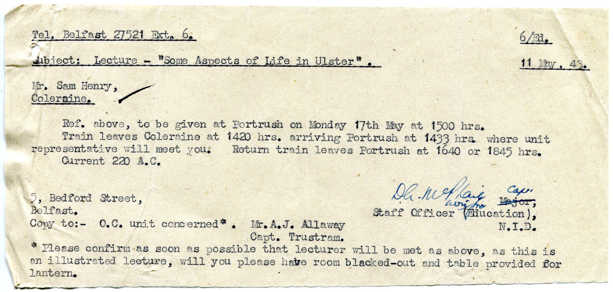 Typed letter on strip of paper to Sam Henry re lecture to troops. Confirming lecture and travel arrangements for 17th May 1943 at 3pm in Portrush. Lecture titled, 'Some Aspects of Life in Ulster'. Copy of letter sent to Mr A J Allaway and Captain Trustram.
