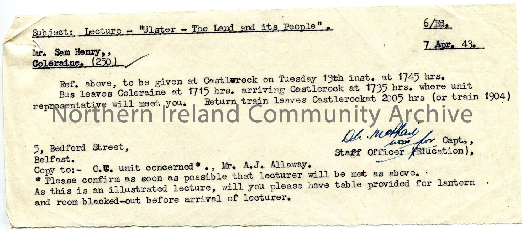 Typed letter on strip of paper to Sam Henry re lecture to troops. Confirming lecture and travel arrangements for lecture in Castlerock on 13th April 1943 at 5.45pm.