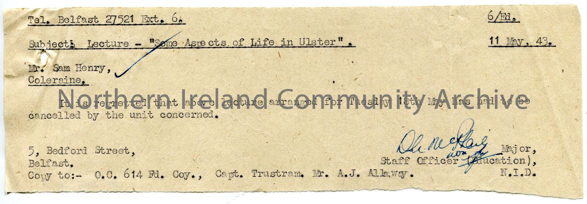 Typed letter on strip of paper to Sam Henry re lecture to troops. Informing Sam that the lecture 'Some Aspects of Life in Ulster' on 18th May 1943 has been cancelled by the unit concerned. Copy of letter sent to O.C. 614 Fd. Coy., Mr A J Allaway and Captain Trustram.