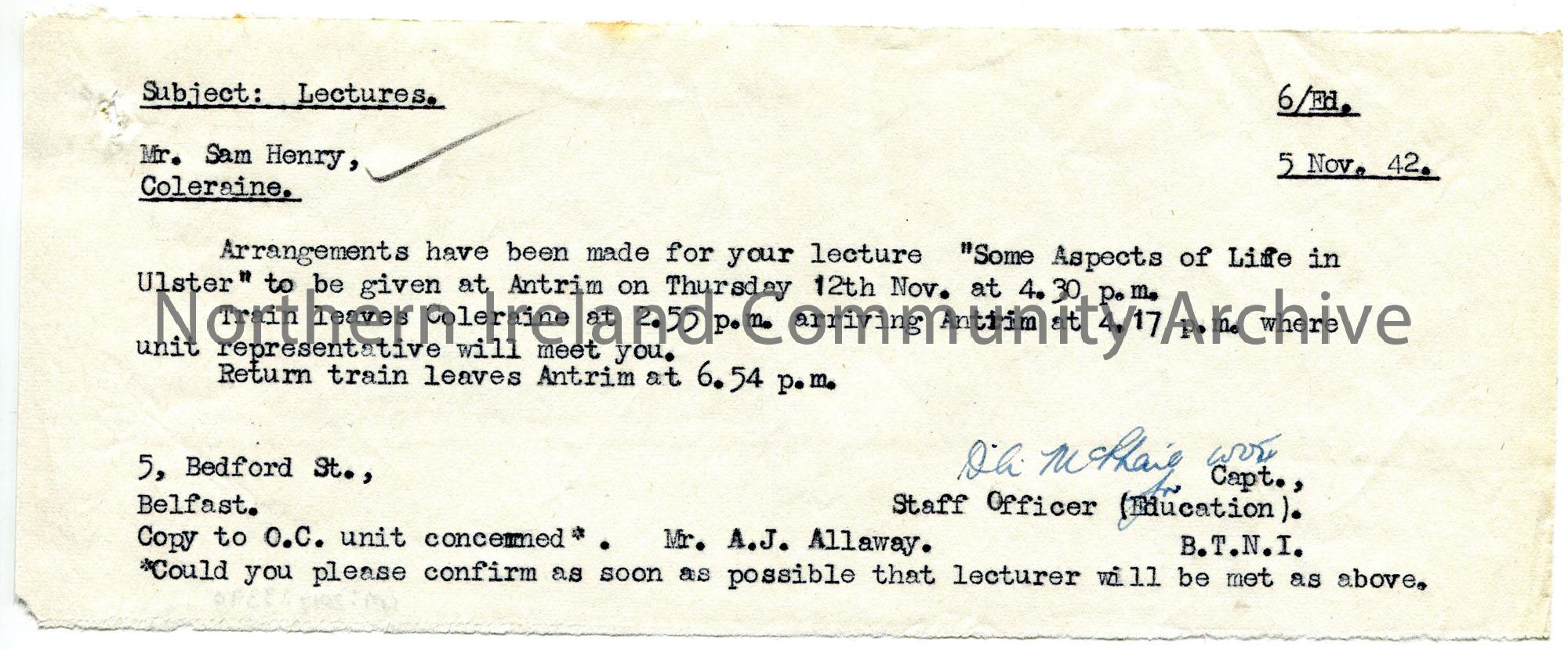 Typed letter on strip of paper to Sam Henry re lectures to troops. Confirming arrangements for Sam's lecture 'Some Aspects of Life in Ulster' at Antrim on 12th November 1942. Confirms travel arrangements by train. [Lecture later cancelled by Sam - CM:2017:3393].