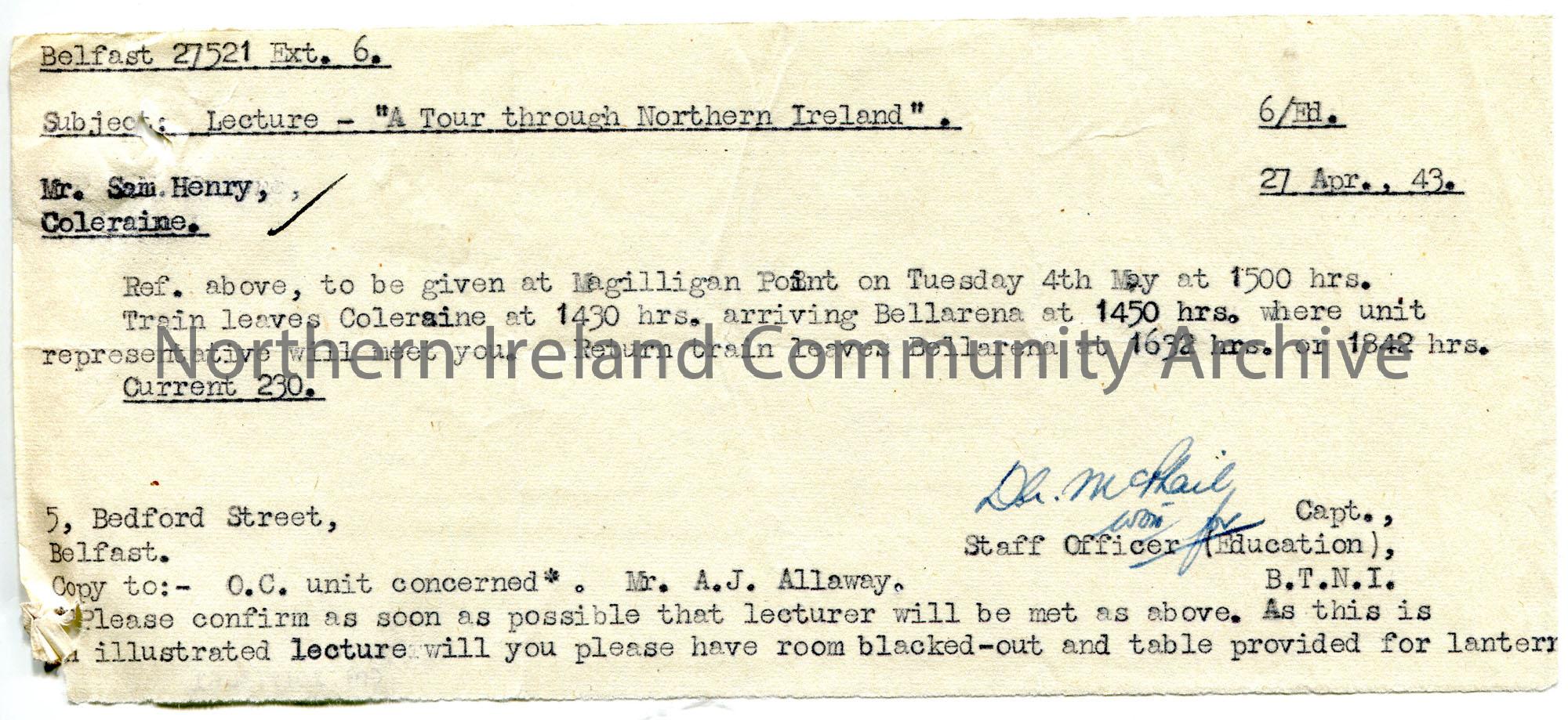 Typed letter on strip of paper to Sam Henry re lectures to troops. Confirming lecture and travel arrangements to Magilligan Point on 4th May 1943 at 3.00pm. Lecture titled, 'A Tour through Northern Ireland'. Copy of letter sent to Mr A J Allaway.