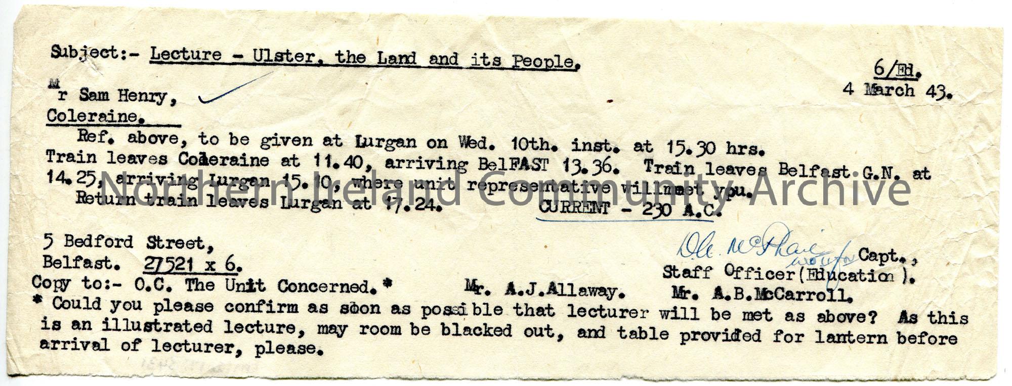 Typed letter on strip of paper to Sam Henry re lectures to troops. Confirming travel arrangements for lecture on 10th March 1943 in Lurgan at 3:30pm.