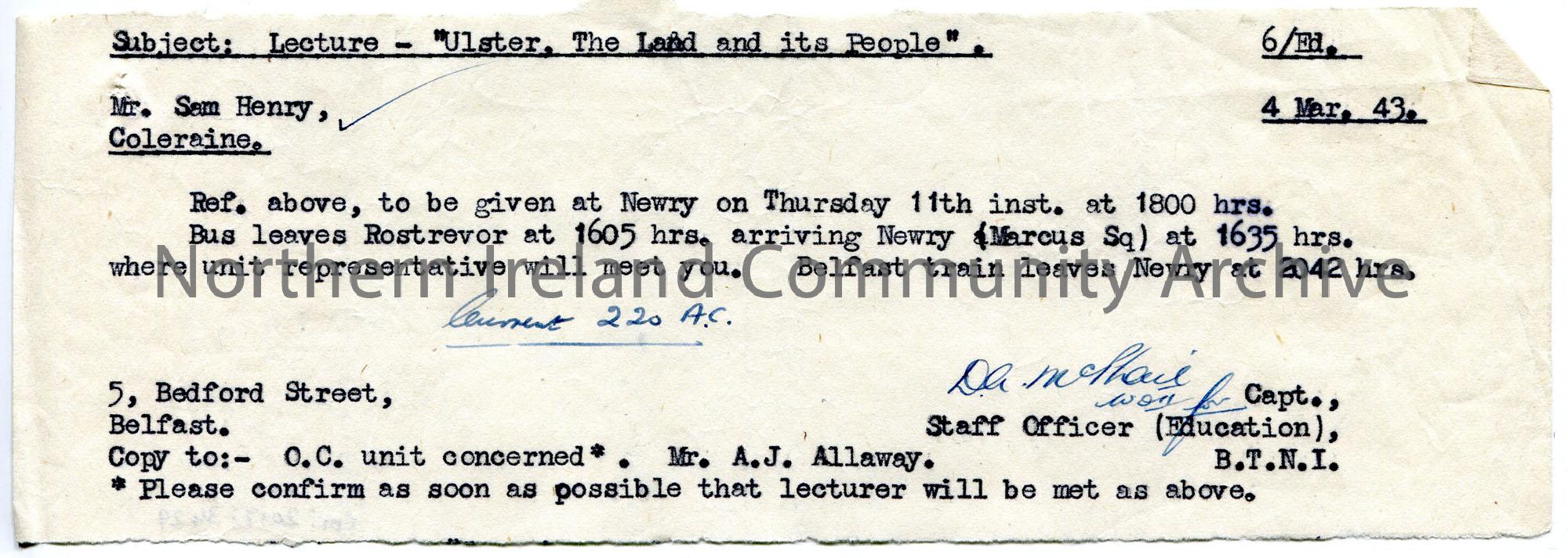 Typed letter on strip of paper to Sam Henry re lectures to troops. Confirming travel arrangements for lecture on 11th March 1943 in Newry.