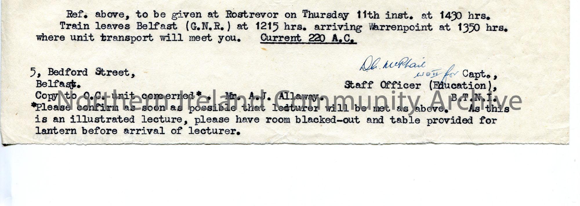 Typed letter on strip of paper to Sam Henry re lectures to troops. Confirming travel arrangements for lecture on 11th March 1943 in Rostrevor at 14:30.