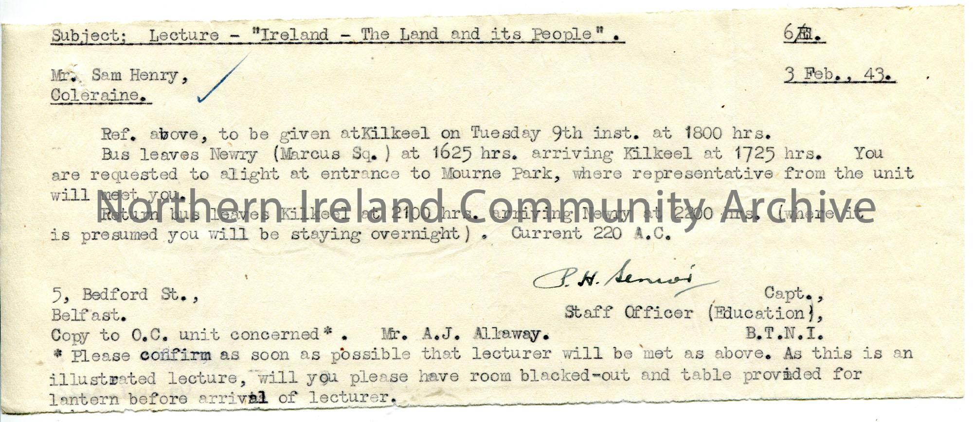 Typed letter on strip of paper to Sam Henry re lectures to troops. Notifying Sam of travel arrangements to lecture in Kilkeel on 9th February 1943 at …