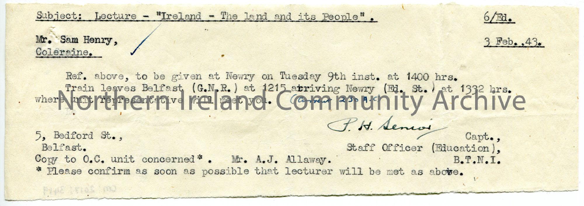 Typed letter on strip of paper to Sam Henry re lectures to troops. Notifying Sam of travel arrangements to lecture on 9th February 1943.