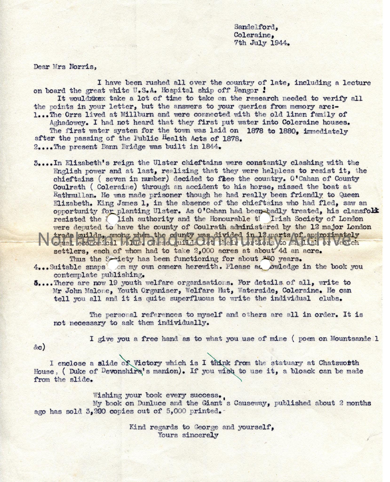 Typed letter re answers to questions for book by Mrs Norris. Refers to sales figures of own book on Dunluce and Causeway
