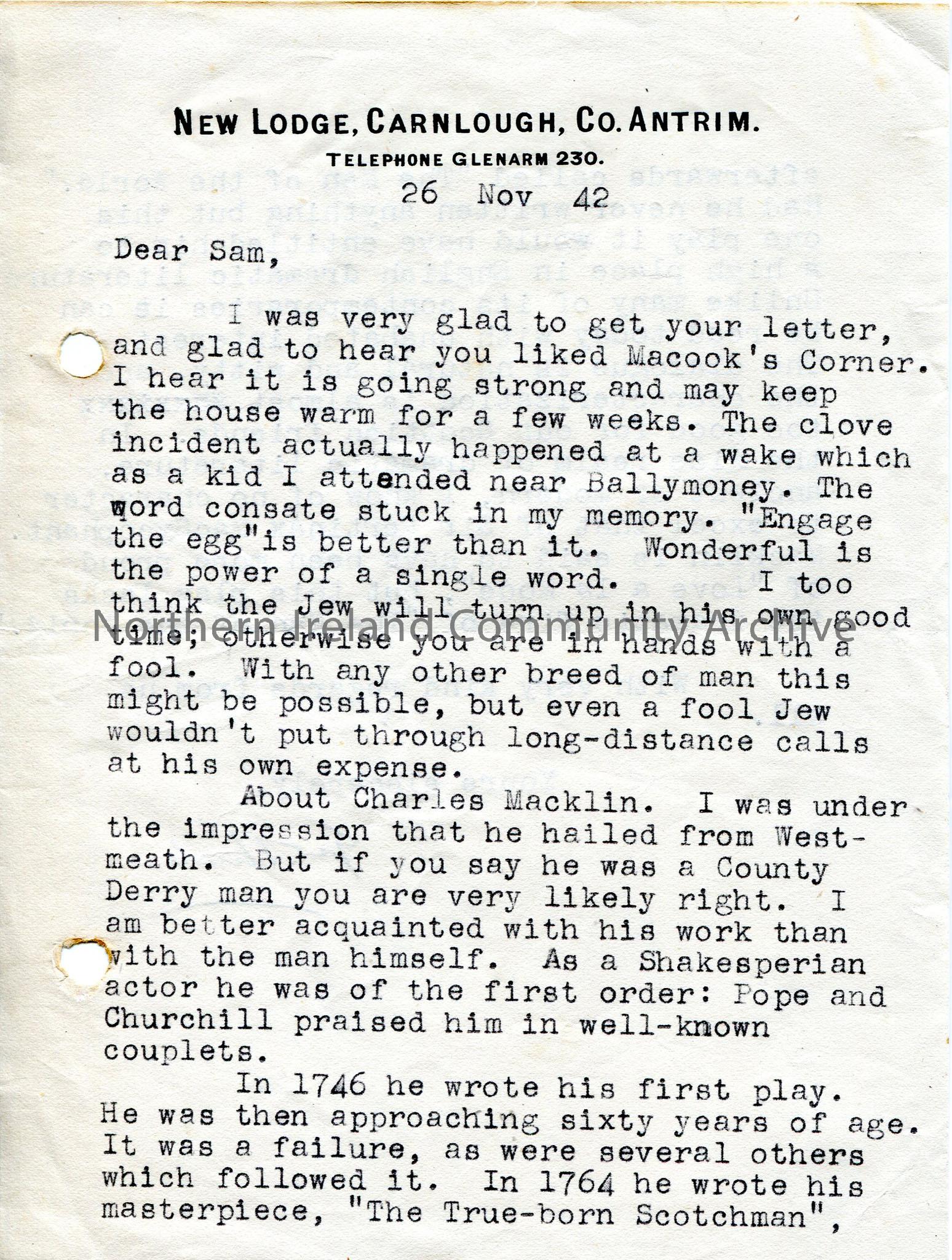 Typed letter relating to local topics obviously subject of other conservation and the background of Charles Macklin, an 18th century playwright